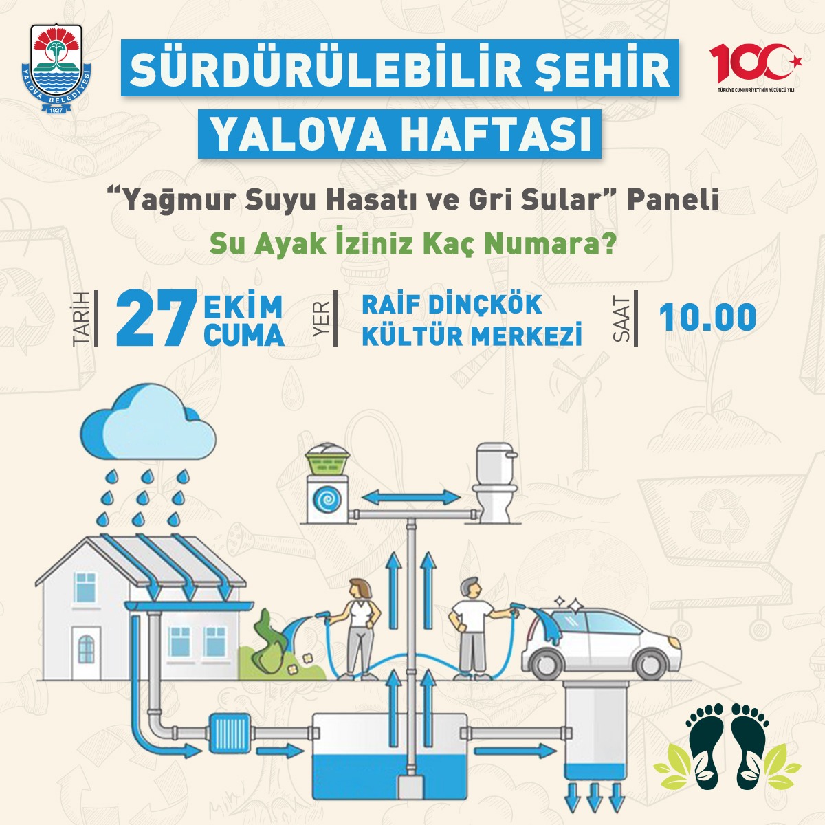 Yalova Belediyesi, gri su ve yağmur suyu kaynaklarının etkili kullanılması amacıyla “Su Ayak İziniz Kaç Numara?” başlıklı bir panel düzenleyecek. 27 Ekim Cuma günü saat 10.00’da Raif Dinçkök Kültür Merkezi meclis salonunda gerçekleşecek panelde, katılımcılar uzman ve başarılı uygulama örnekleri ile su ayak izini en aza indirme seçeneklerini öğrenme fırsatı bulacaklar.