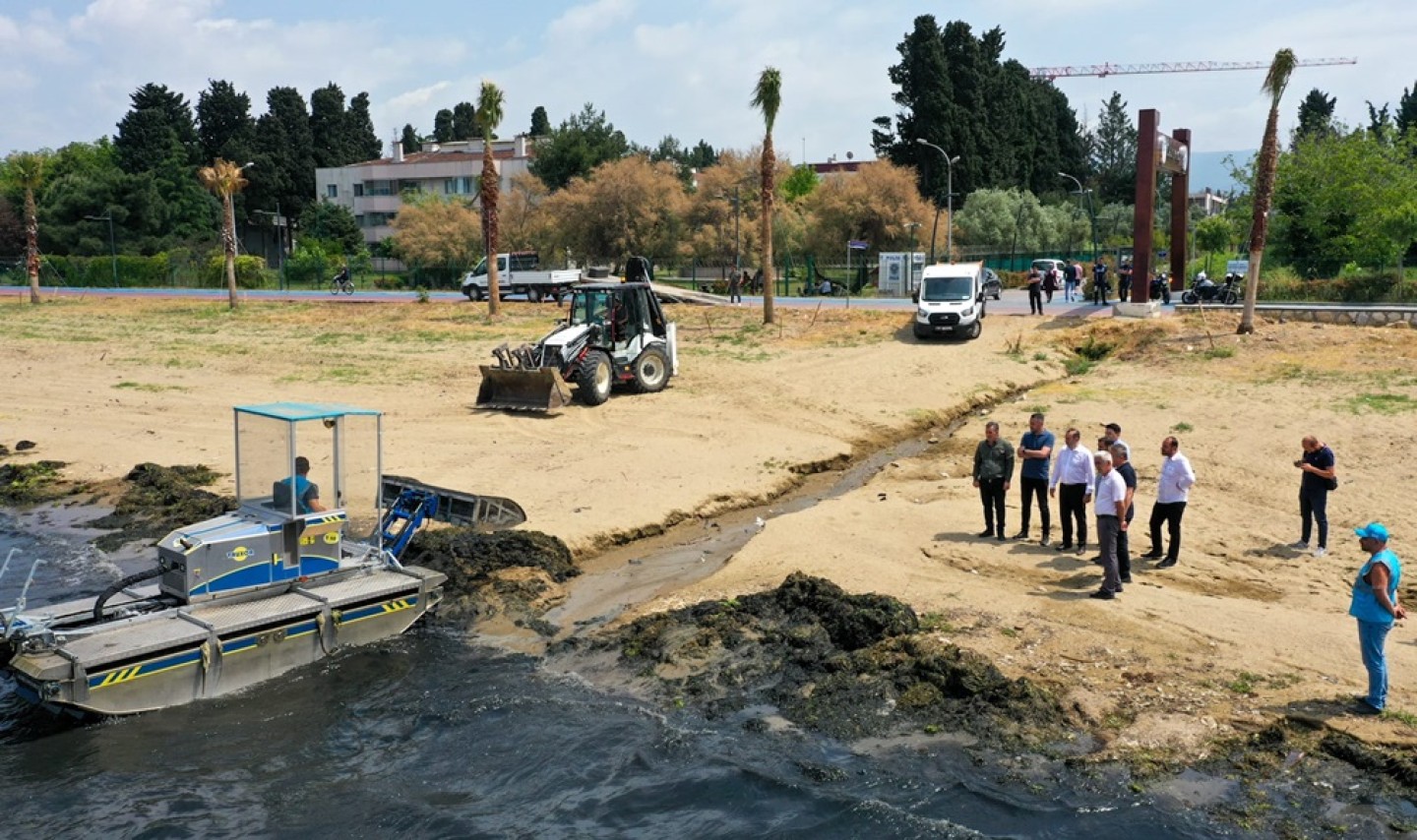 Doğu sahil bandı kumsalında vatandaşların denize girdiği bölgede başlatılan temizlik çalışmasında, kumsalda bulunan otlar temizlenirken, sahil şeridinde bulunan yosunlar ise amfibik adı verilen kepçeyle denizde kumsala çıkartılıyor. Çıkartılan yosunlar bir kaç gün içinde kuruduktan kamyonlarla toplanacak.
