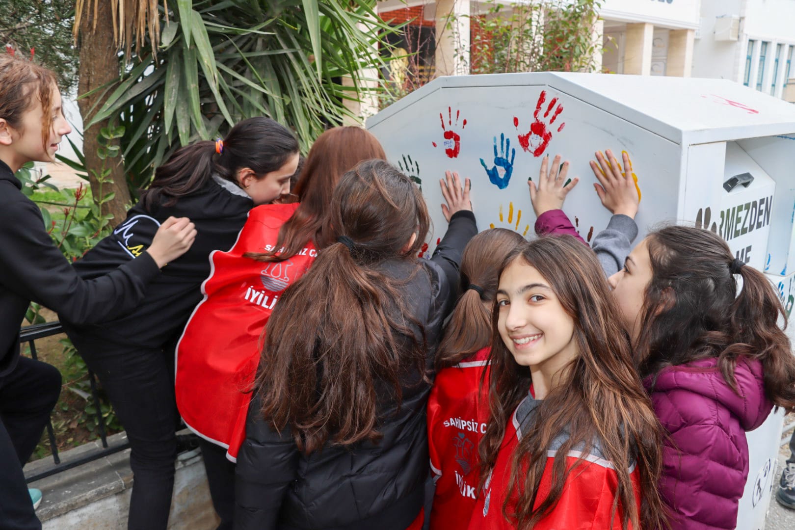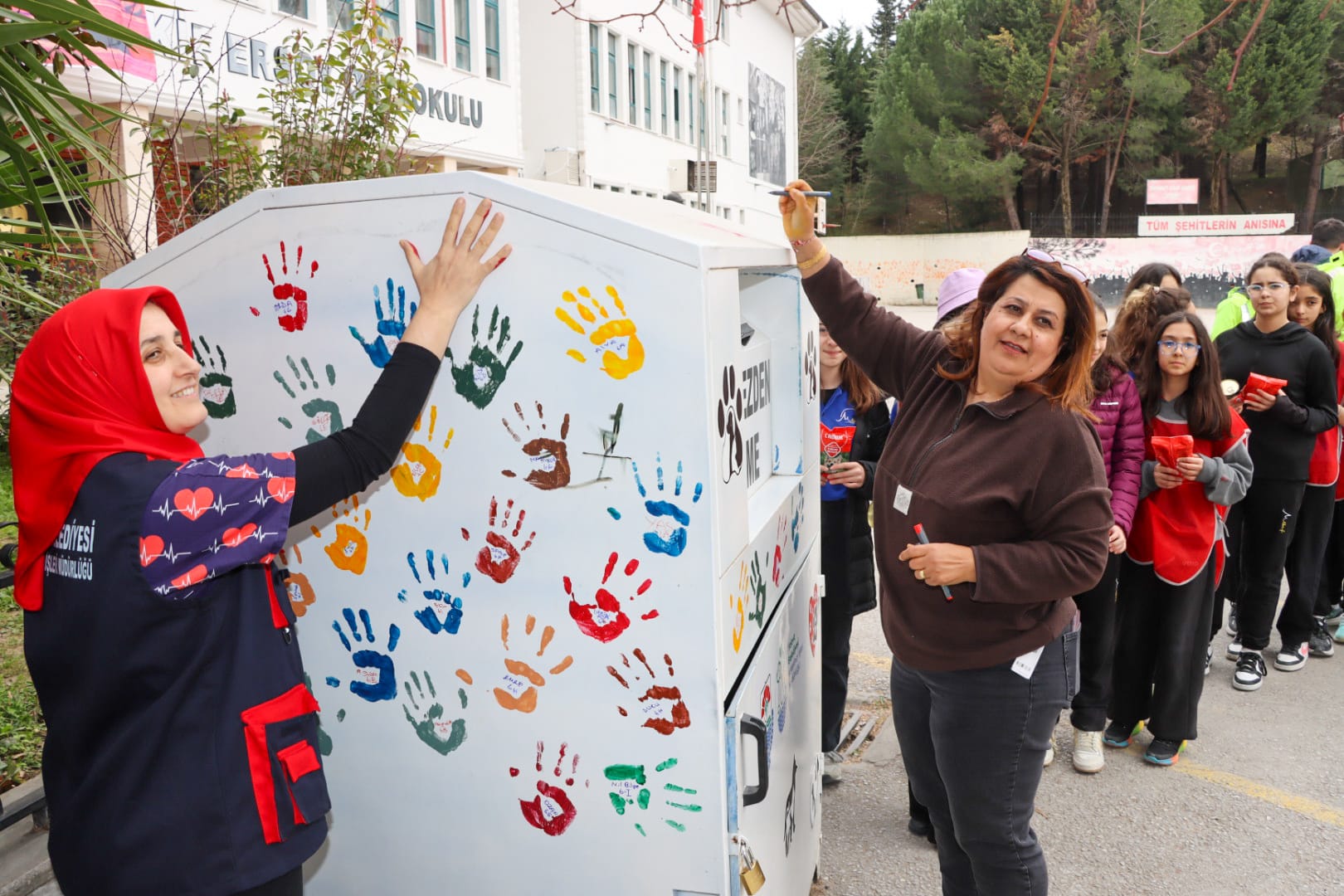Sadece mama toplamakla kalmayan öğrenciler, proje kapsamında farkındalık oluşturmak için de yaratıcı bir etkinlik düzenledi. Boyalarla ellerini renklendiren öğrenciler, mama kumbarasının üzerine el izlerini bırakarak “sokak hayvanlarını görmezden gelmeyelim” mesajını verdi. Bu etkinlik hem projeye görsel bir anlam kazandırdı hem de sokak hayvanlarına yönelik duyarlılığın artırılmasına katkı sağladı.