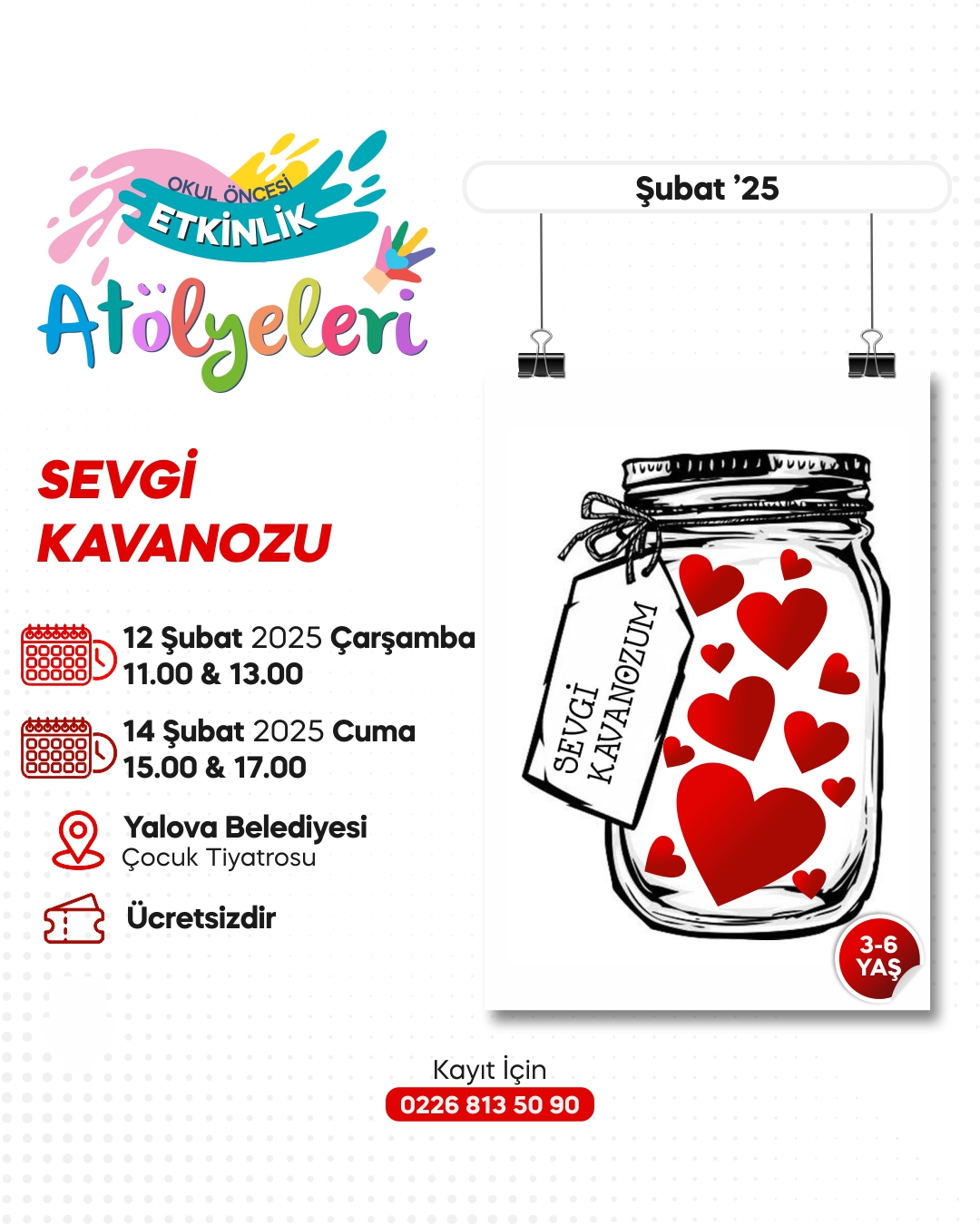 Yalova Belediyesi Çocuk Tiyatrosu, Şubat ayında minikler için birbirinden renkli oyunlar ve atölyeler hazırladı. 8 Şubat Cumartesi günü saat 13.00 ve 15.00'te "Benimle Oynar mısın?" adlı interaktif çocuk oyunu, çocukları eğlenceli bir maceraya davet ediyor. 12 Şubat Çarşamba günü ise "Sevgi Kavanozu" adlı okul öncesi etkinlik atölyesi, saat 11.00, 13.00 ve 14 Şubat Cuma günü 15.00 ve 17.00'de çocuklarla buluşacak.
