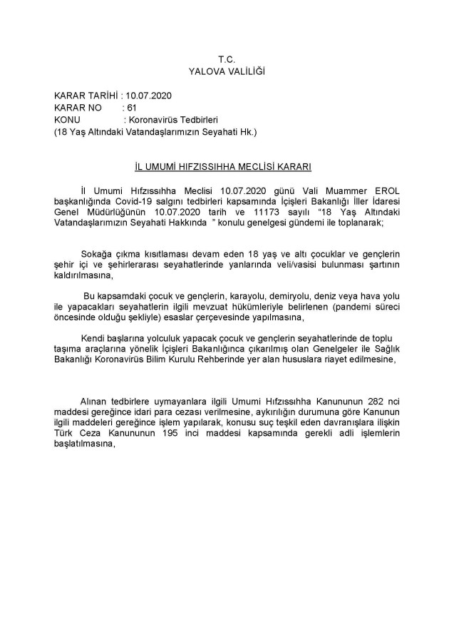 61 Nolu Hıfzıssıhha Kararı