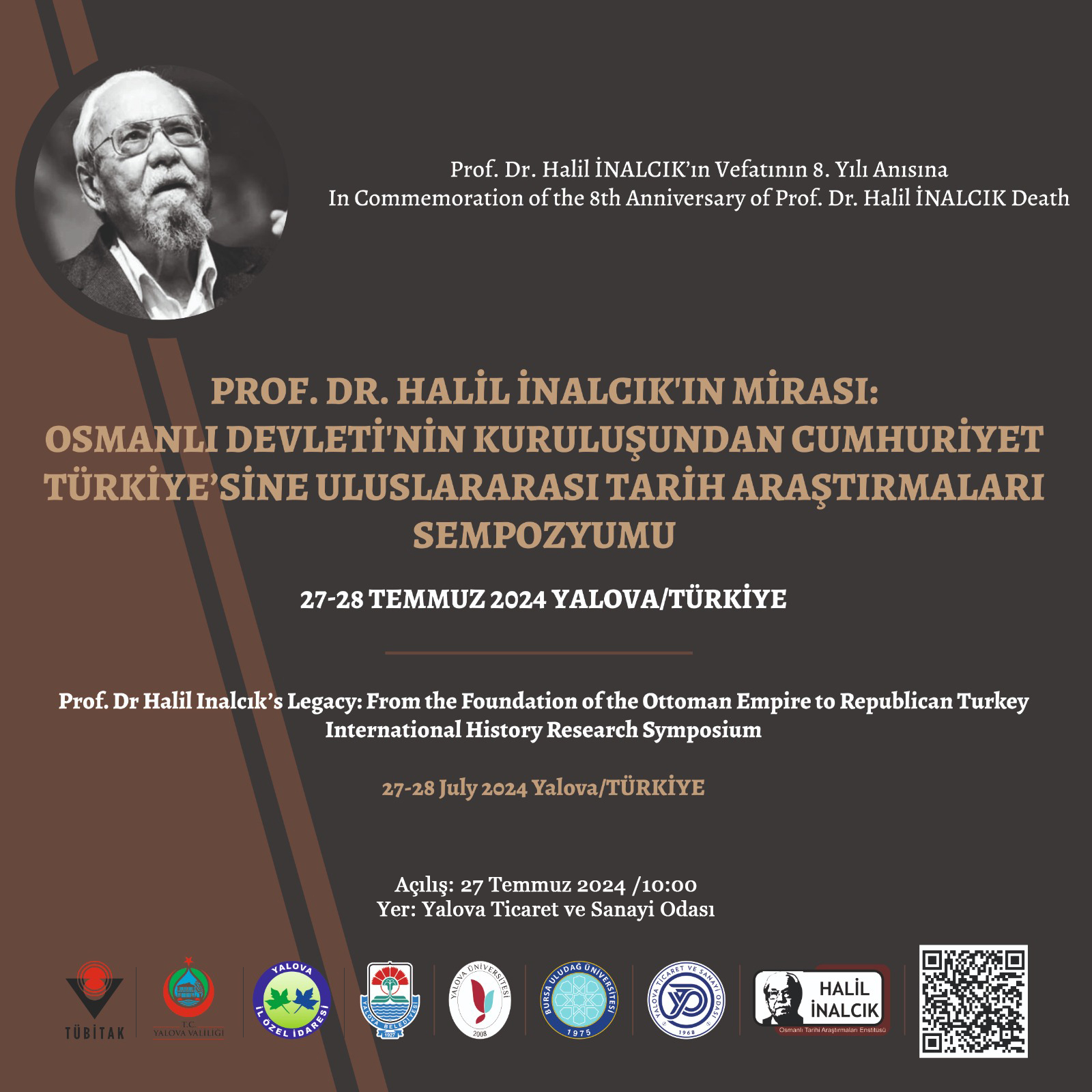 Prof. Dr. Halil İnalcık'ın vefatının sekizinci yılı anısına düzenlenecek olan "Prof. Dr. Halil İnalcık'ın Mirası: Osmanlı Devleti'nin Kuruluşundan Cumhuriyet Türkiye'sine Uluslararası Tarih Araştırmaları Sempozyumu" 2728 Temmuz 2024 tarihlerinde Yalova Ticaret ve Sanayi Odasında gerçekleştirilecektir.