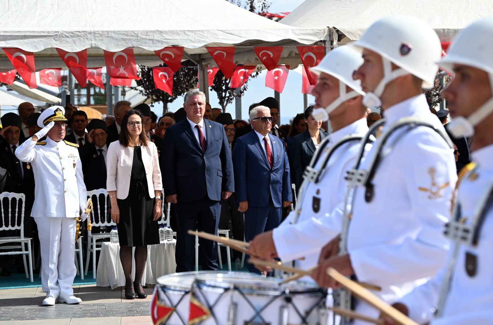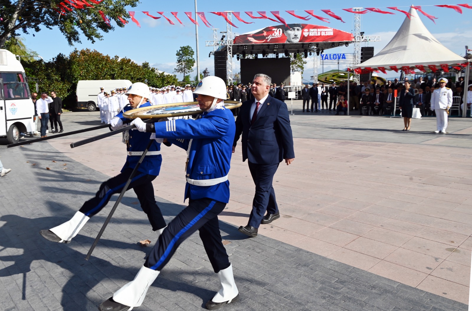 15 Temmuz Demokrasi ve Cumhuriyet Meydanı'nda düzenlenen resmi törenle başlayan etkinliklere; Saygı duruşu, İstiklal Marşı ve Gazi Mustafa Kemal Atatürk’ün huzuruna çelenk sunumları ile başlandı. Resmi, 126. Filo Komutanlığı’na ait T-41 uçaklarının gerçekleştirdiği gösteri uçuşu izleyicilere heyecan dolu anlar yaşattı. Yalova Valisi Dr. Hülya Kaya, Garnizon Komutanı Tuğamiral Mehmet Tahir Göncüoğlu ve Yalova Belediye Başkanı Mehmet Gürel katılımcıların bayramını kutladı. Deniz Yarbay Temuçin Öncü, günün anlam ve önemine dair konuşmasında, Türk milletinin bağımsızlık mücadelesinin zaferle taçlandığını vurguladı.