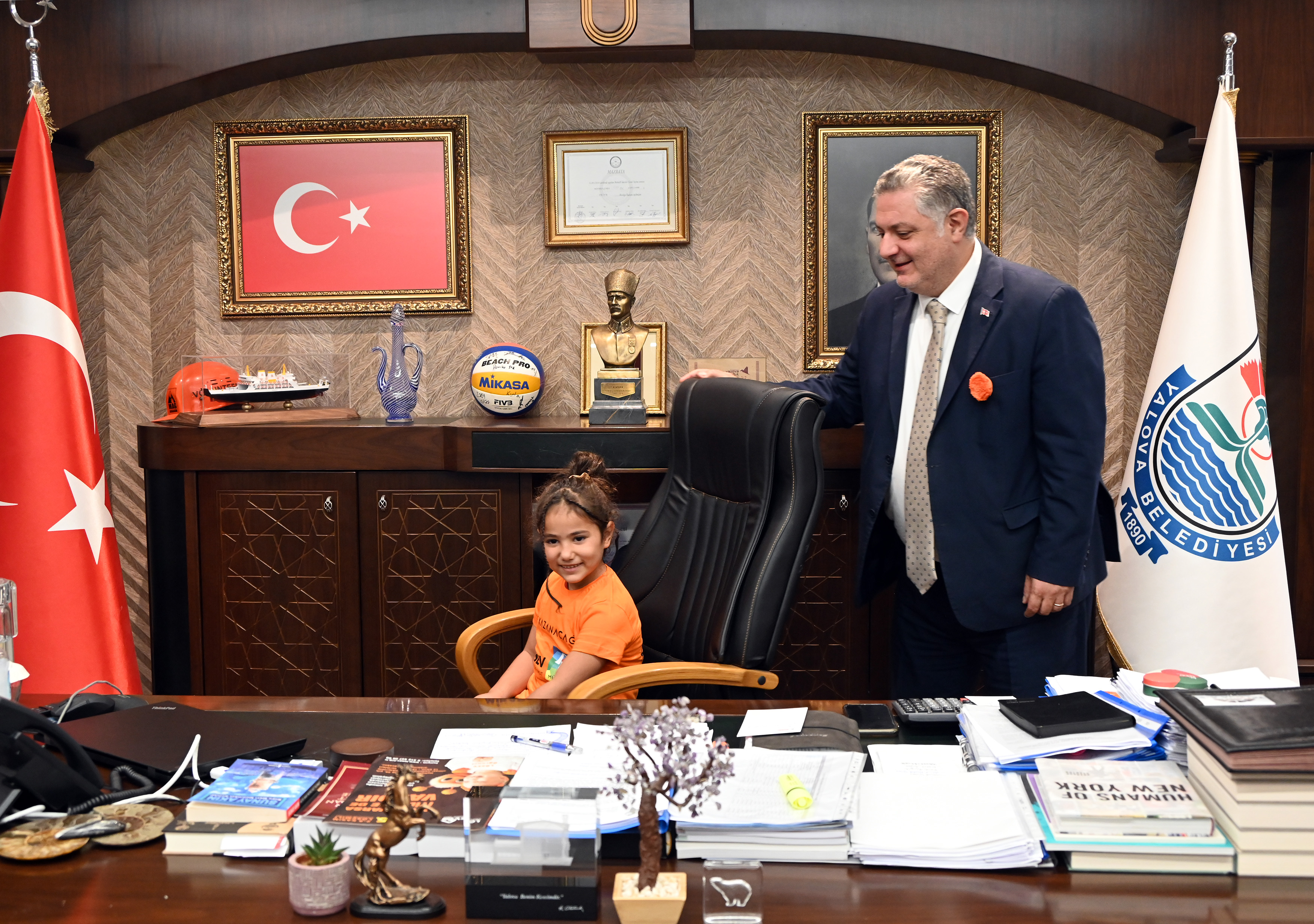 Ziyaretin en renkli anı, 6 yaşındaki Yağmur Çelik’in başkanlık koltuğuna oturmasıyla yaşandı. Minik Yağmur, kısa bir süreliğine de olsa Yalova’nın en küçük başkanı oldu. Başkan Gürel, tüm çocuklara çeşitli hediyeler takdim ederek onların mutluluğuna ortak oldu.