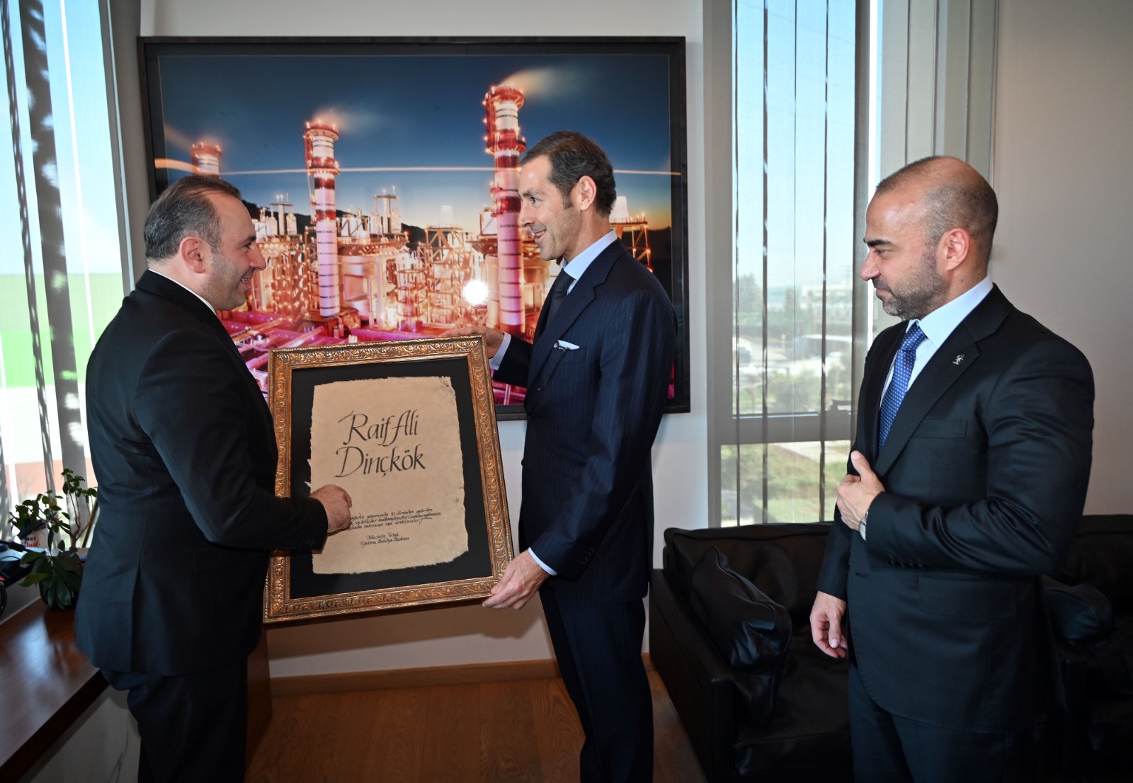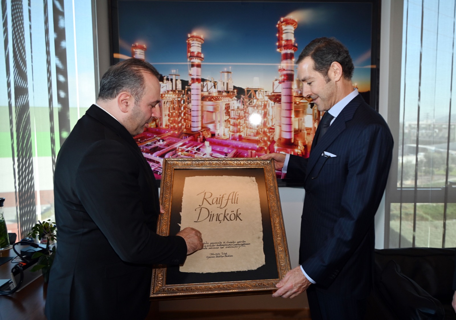 Görüşme sonrasında Başkan Tutuk, Yönetim Kurulu Başkanı Dinçkök’e, Yalova Aronyası ve özel olarak üretilen Yalova Kağıdı’na isminin hat sanatı ile yazdığı tabloyu hediye etti.