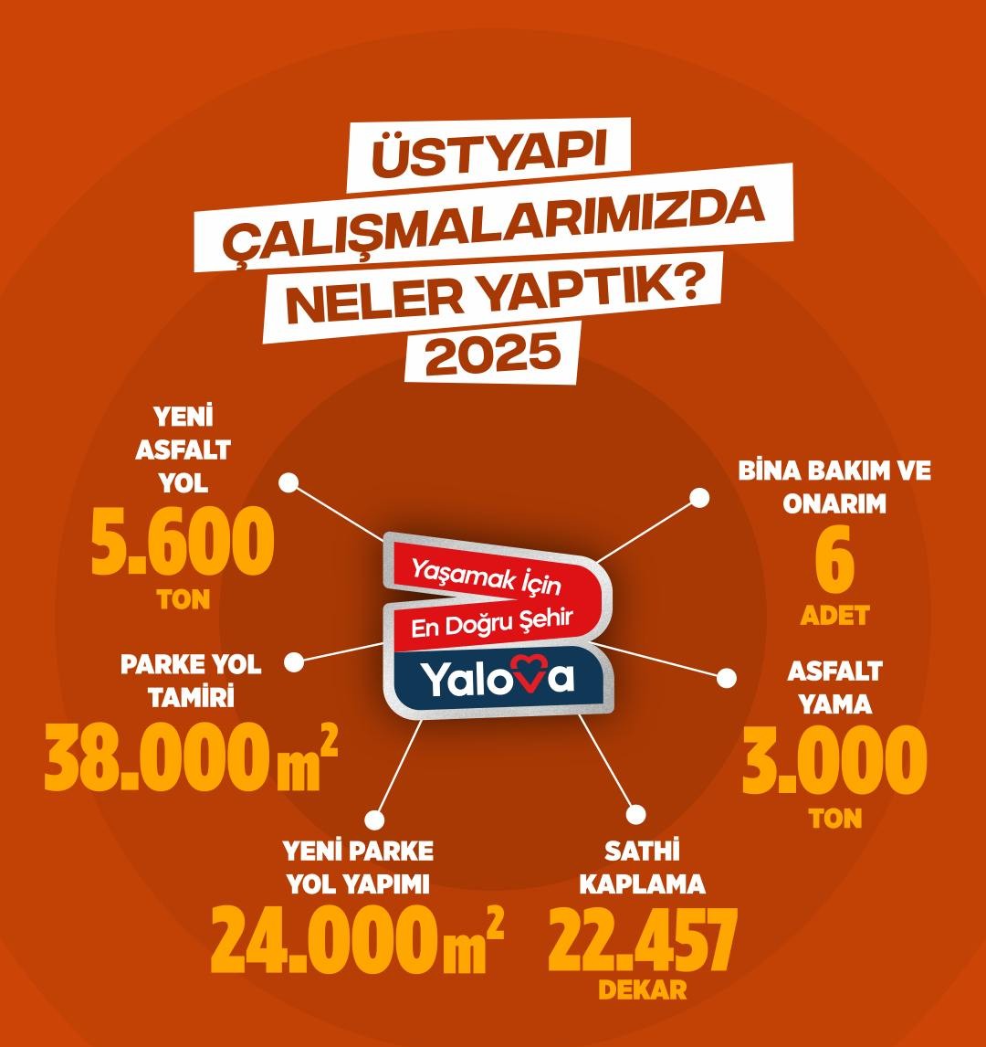 Yalova Belediyesi, 2025 yılı boyunca kent genelinde yürüttüğü üstyapı çalışmalarıyla yolları daha güvenli, konforlu ve modern hale getirdi. Paylaşılan verilere göre yıl boyunca asfalt, parke yol ve bakım-onarım çalışmalarında önemli rakamlara ulaşıldı.
