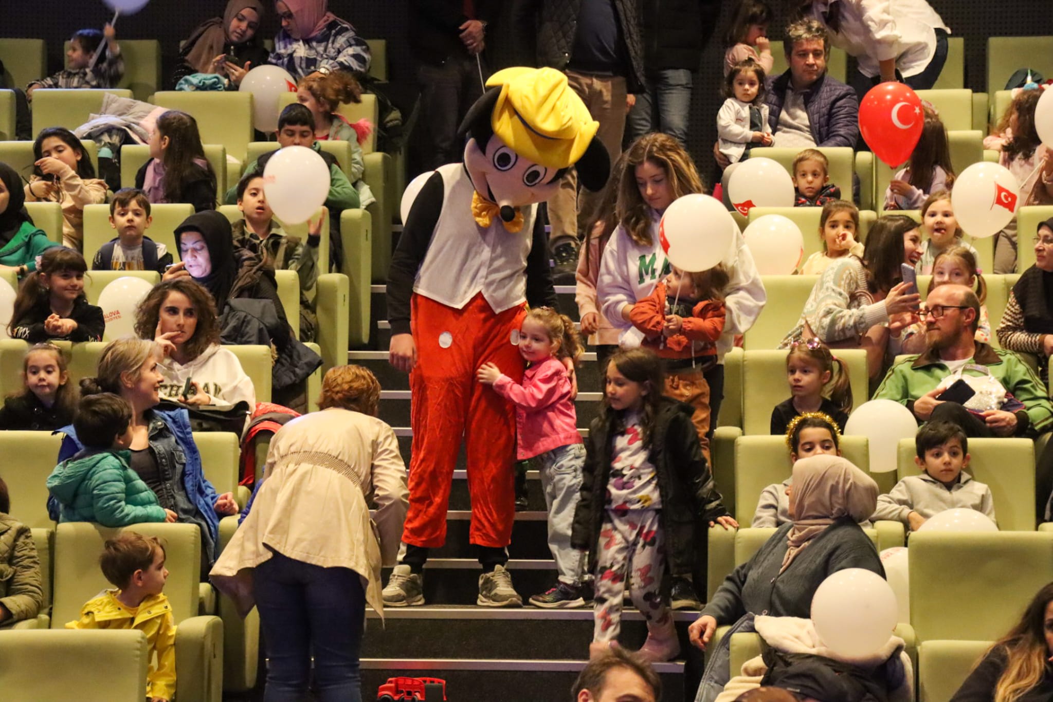 Toplam 3 seans olarak 13:00, 15:00 ve 17:00 saatlerinde minik izleyiciler için sahnelenen ‘Mini Mini Bir Kuş’ isimli müzikal tiyatro oyununun ilk seansını deprem bölgesinden ilimize gelen depremzede çocuklarda izledi.