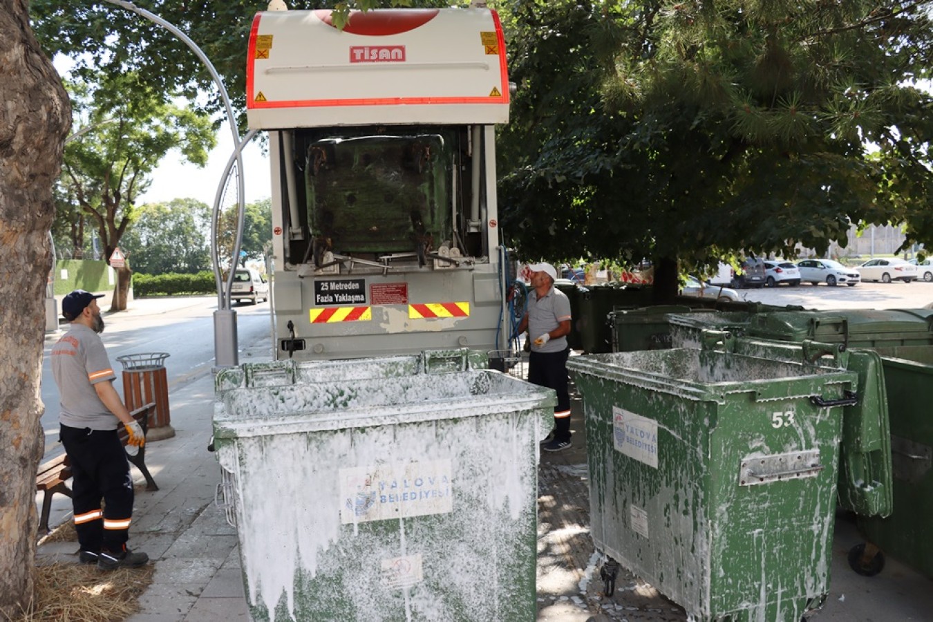 Mahalle, cadde ve sokaklarda temizlik çalışmalarına devam eden ekipler, çöp konteynerlerinin deterjan ve dezenfektanlı tazyikli sularla yıkamasını gerçekleştiriyor. Şehir merkezinde mahalle bazlı çöp konteynırlarını belli bir noktada toplayan Yalova Belediyesi ekipleri, yapmış oldukları bu temizlik çalışması sırasında trafik akışını da aksatmıyor.