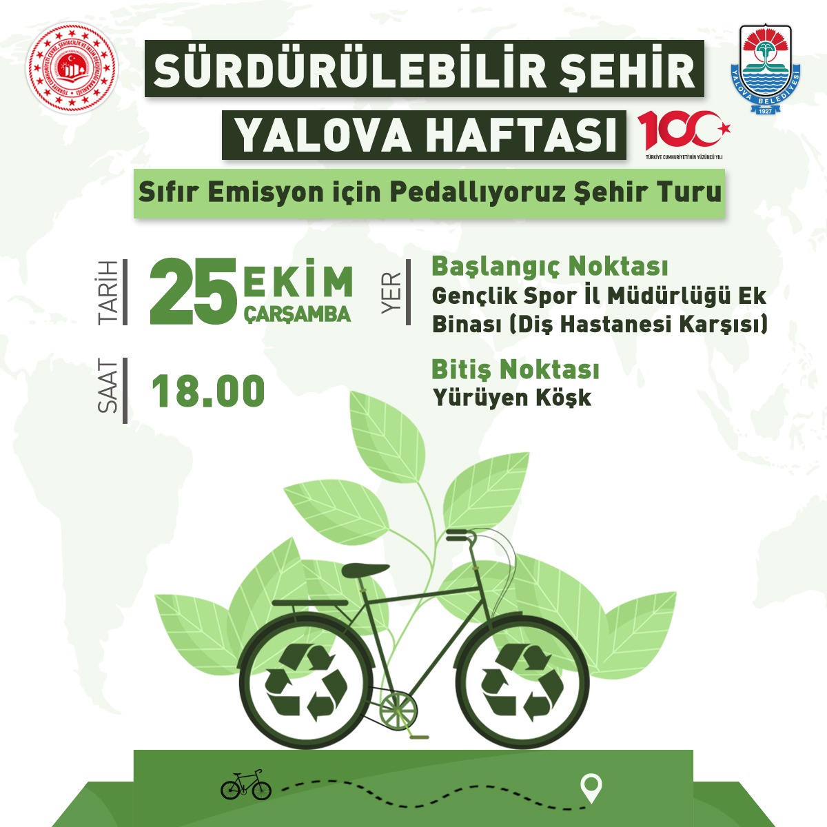 Yalova Belediyesi ve Yalova Gençlik ve Spor İl Müdürlüğü iş birliği ile Yalova’nın sıfır emisyon hedefine katkıda bulunmak ve Sürdürülebilir Şehir Yalova Haftası’nı duyurmak için 25 Ekim Çarşamba günü saat 18.00’da özel bisiklet yolunda akademisyenler, sivil toplum kuruluşları üyeleri, kamu ve özel sektör temsilcileri gibi çeşitli isimler bisikletleriyle katılım sağlayacak. Yalova Gençlik Spor İl Müdürlüğü Ek Binası (Diş Hastane Karşısı) önünden başlayacak olan tur, Yürüyen Köşk’te son bulacak.