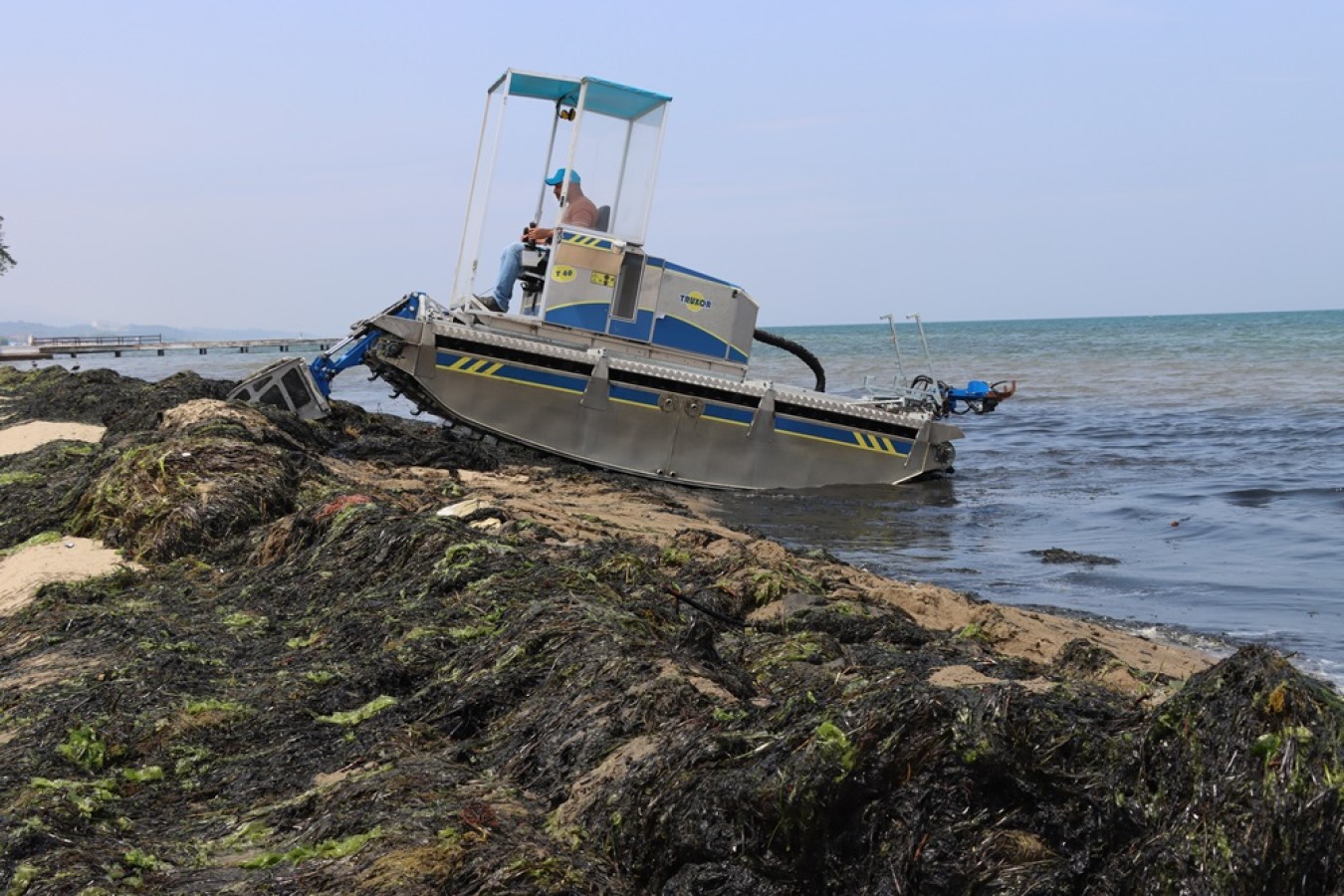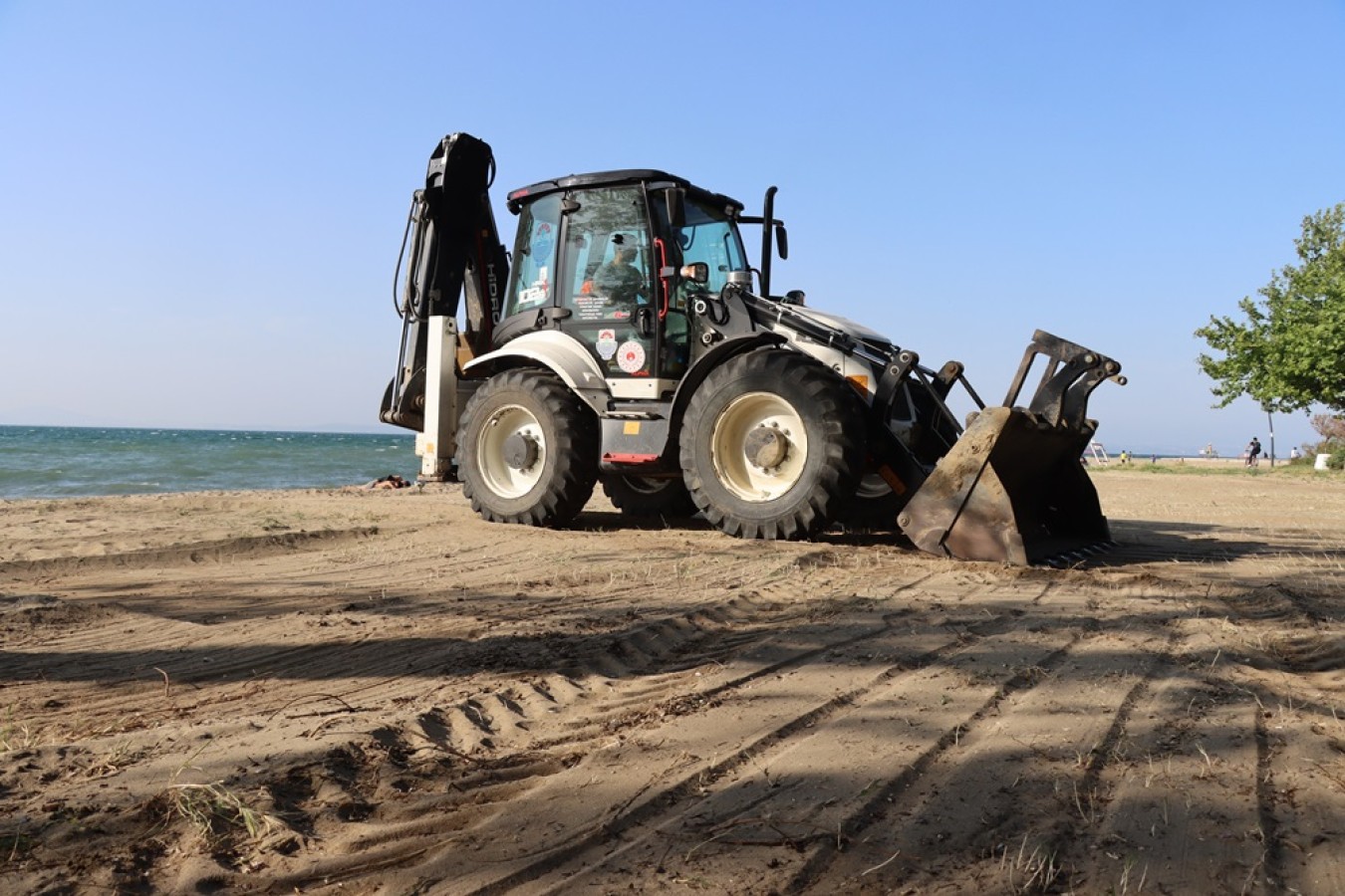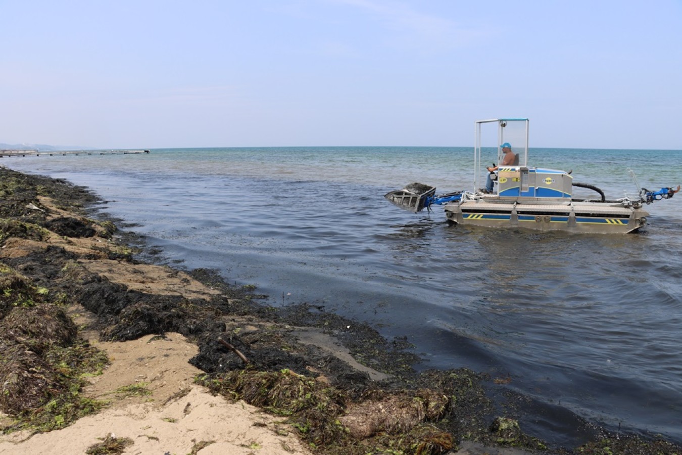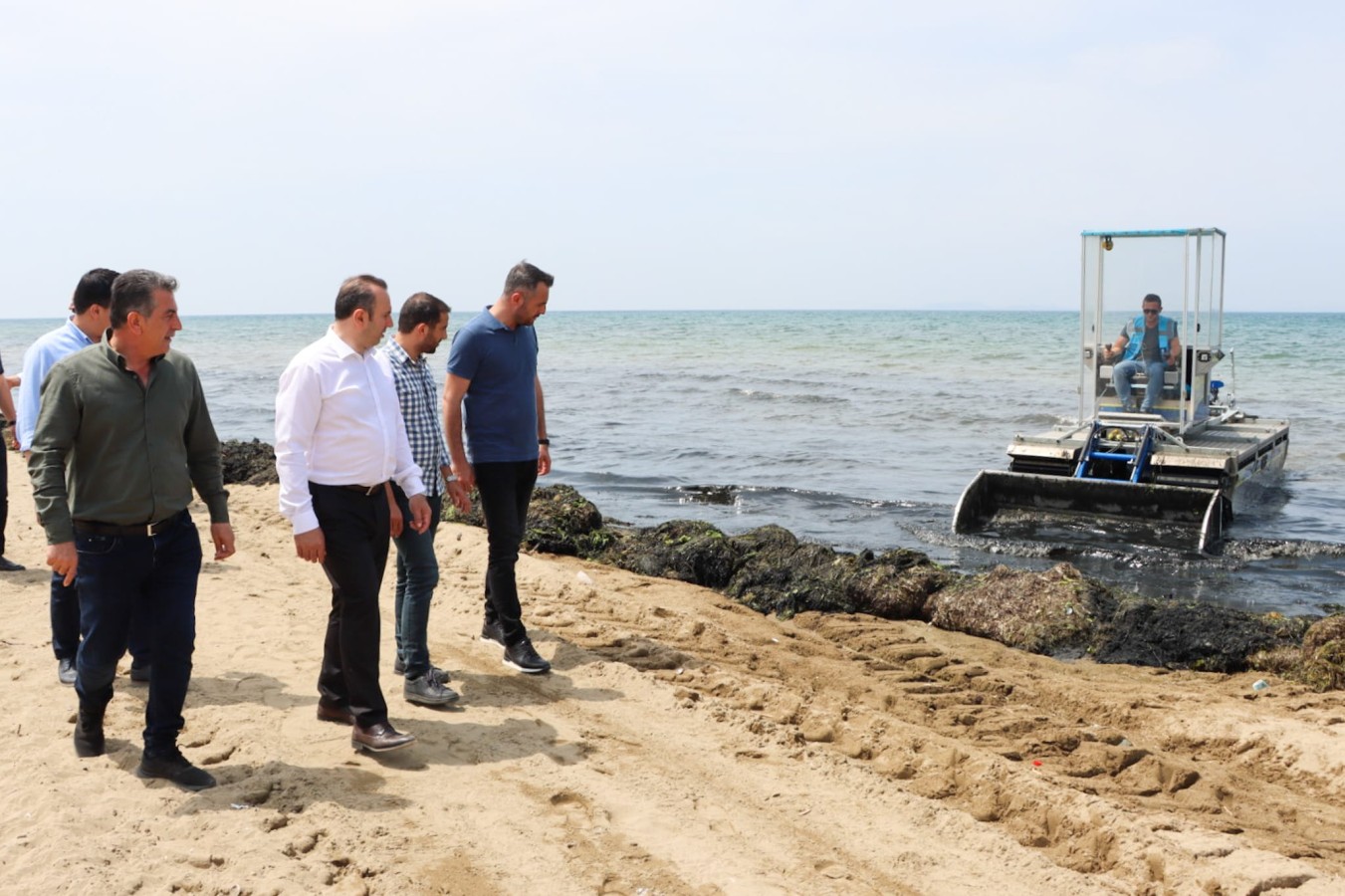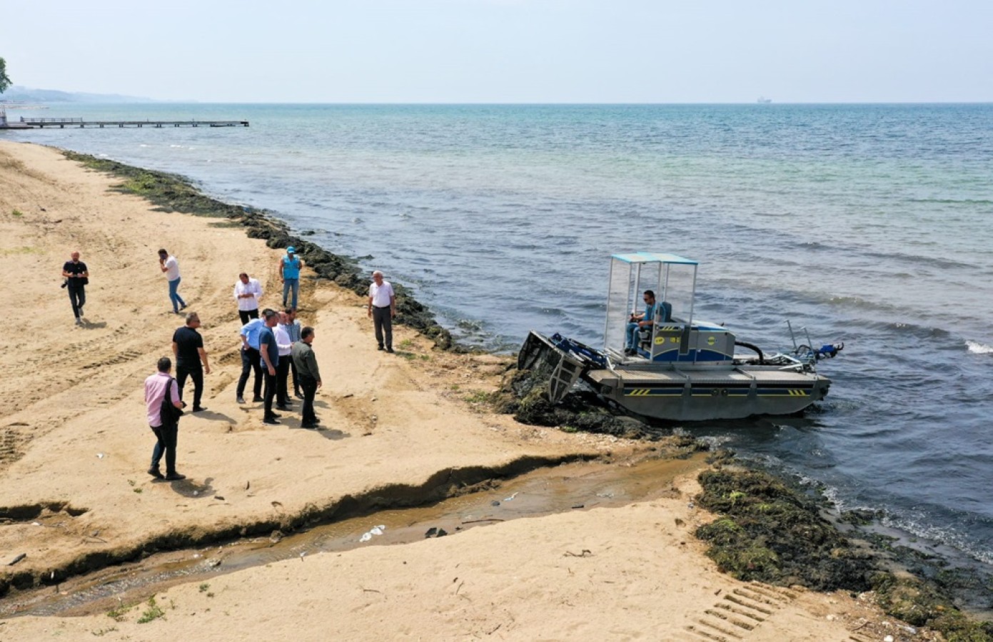 Doğu sahil bandı kumsalında vatandaşların denize girdiği bölgede başlatılan temizlik çalışmasında, kumsalda bulunan otlar temizlenirken, sahil şeridinde bulunan yosunlar ise amfibik adı verilen kepçeyle denizde kumsala çıkartılıyor. Çıkartılan yosunlar bir kaç gün içinde kuruduktan kamyonlarla toplanacak.