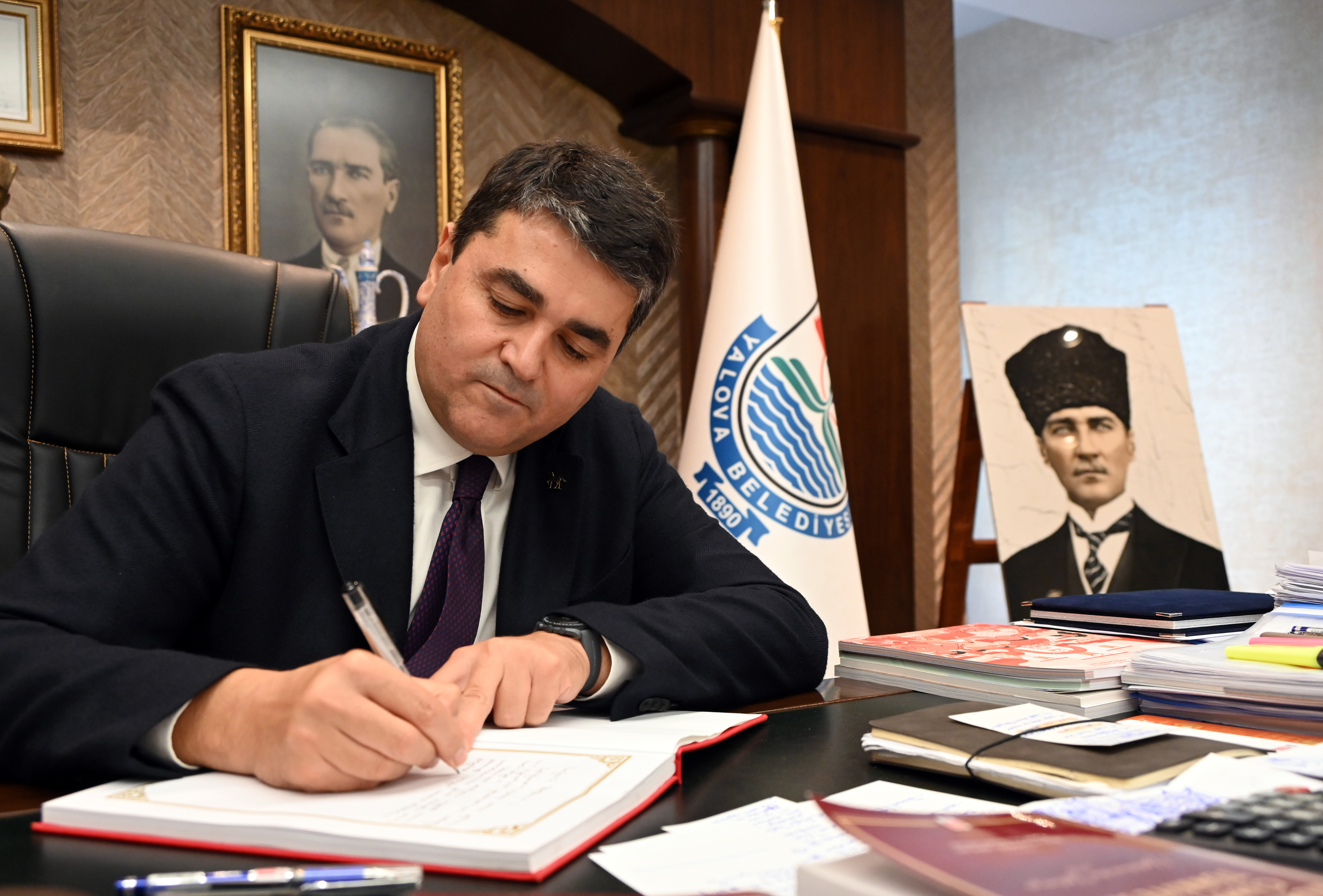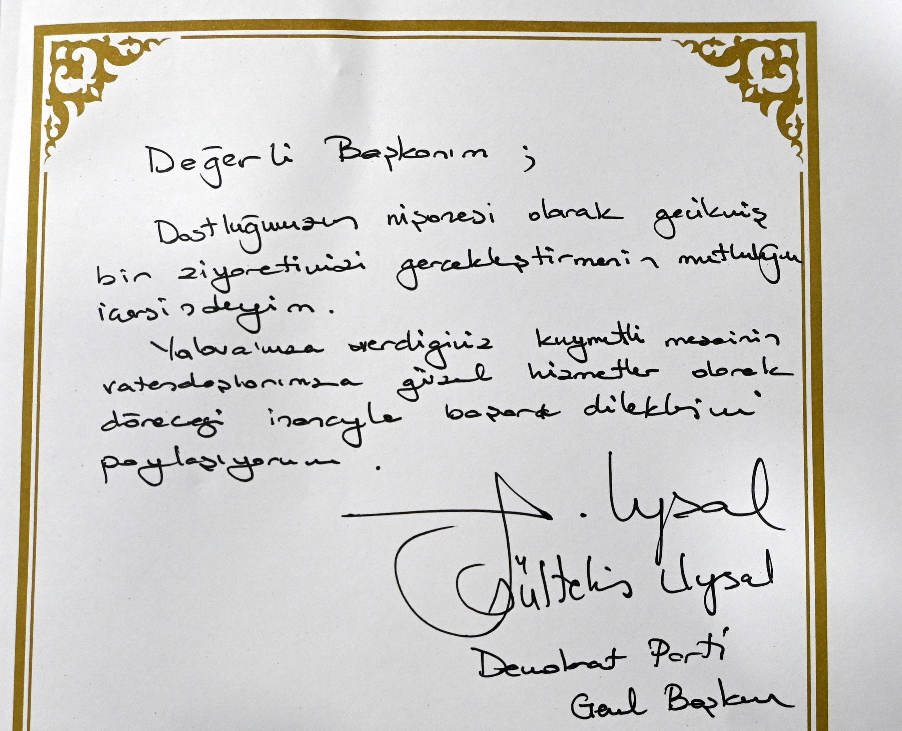 DP Genel Başkanı Gültekin Uysal da Başkan Gürel’e çalışmalarında başarılar dileyerek, belediyenin anı defterini imzaladı.