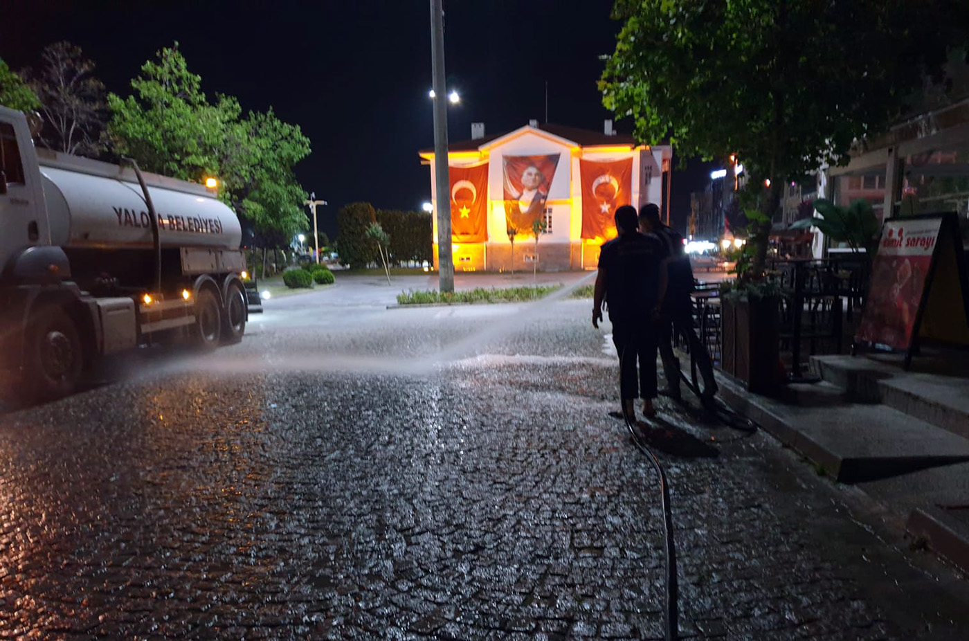 Yalova Belediyesi, yaz aylarında artan nüfusla birlikte şehrin temizliğini sağlamak adına gece saatlerinde kapsamlı temizlik ve yıkama çalışmaları gerçekleştiriyor.