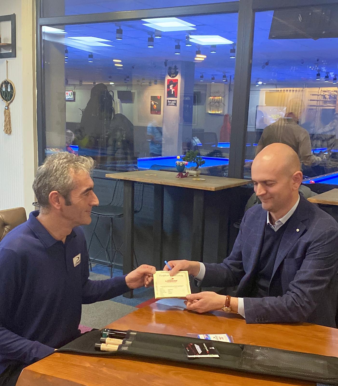 Bilardo sporunun prestijli organizasyonları arasında yer alan turnuvada başarılı bir performans sergileyelerek şampiyon olan Saraç, ödülünü Longoni Cues sahibi Pierluigi Longoni’den teslim aldı.