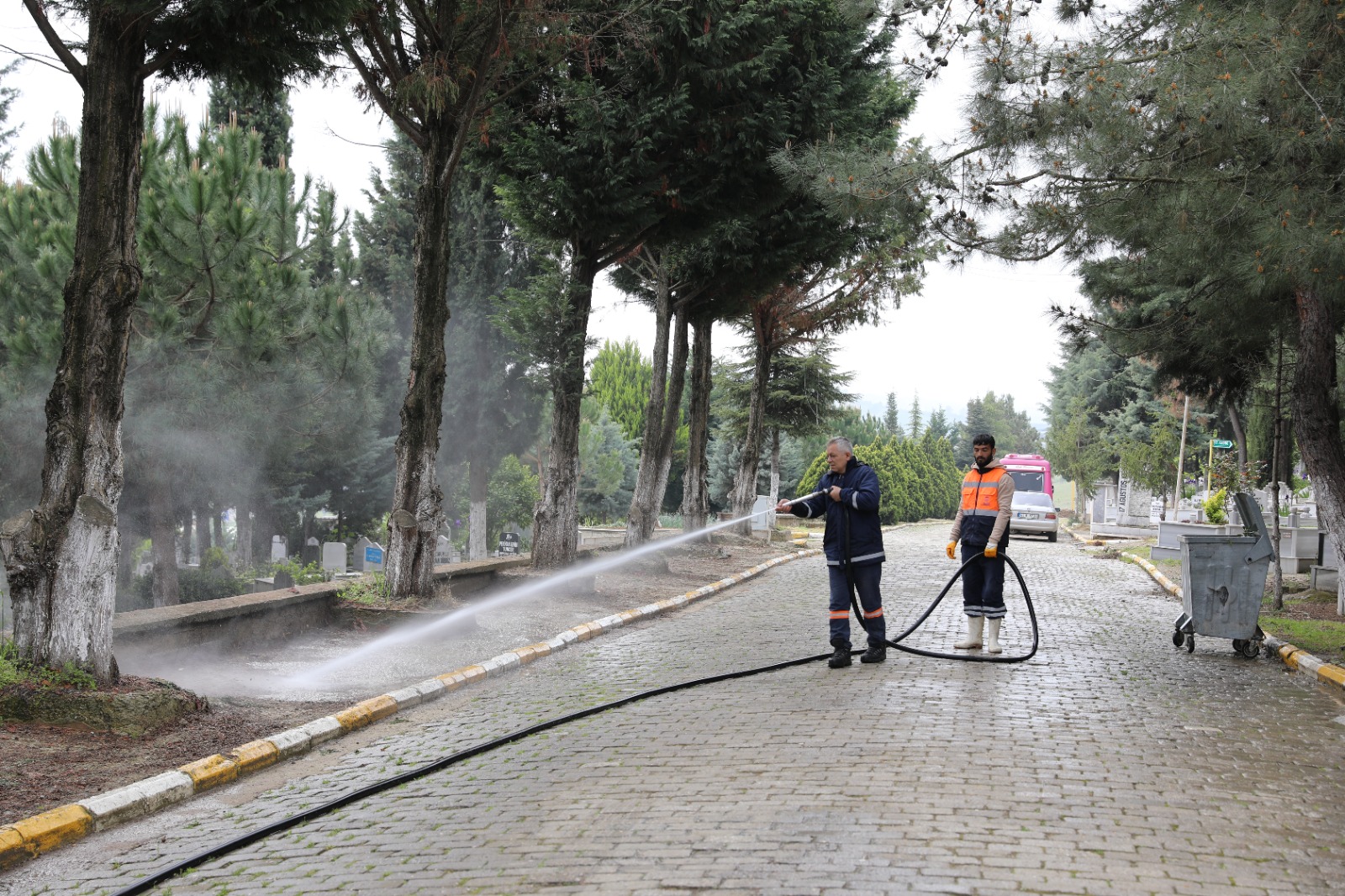Mezarlıklarda çalışma yürüten ekipler; basınçlı su makinesi ile ara yolları, tazyikli su ile ana yolları temizliyor. Ayrıca mezar kenarlarında ve yollarda biriken otların da temizliği büyük bir özenle gerçekleşiyor.