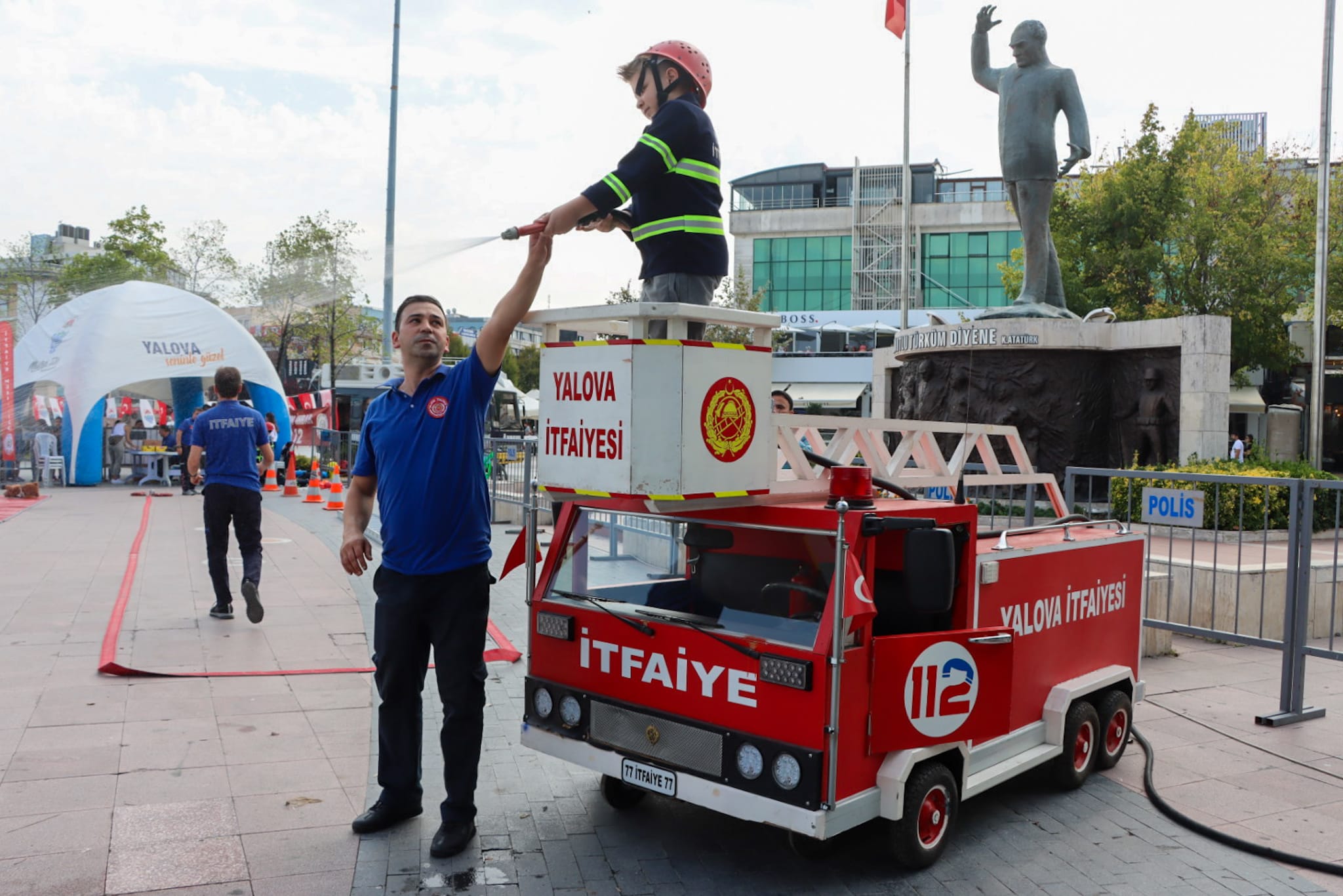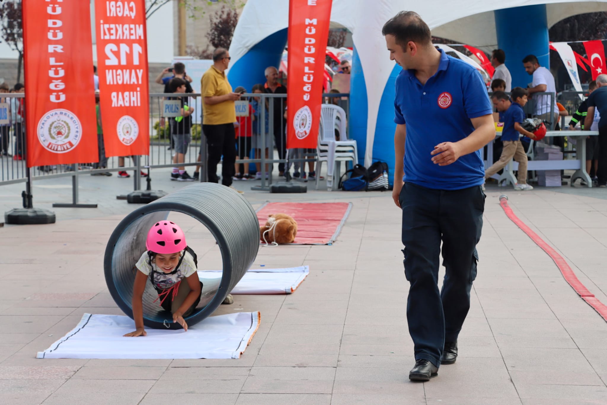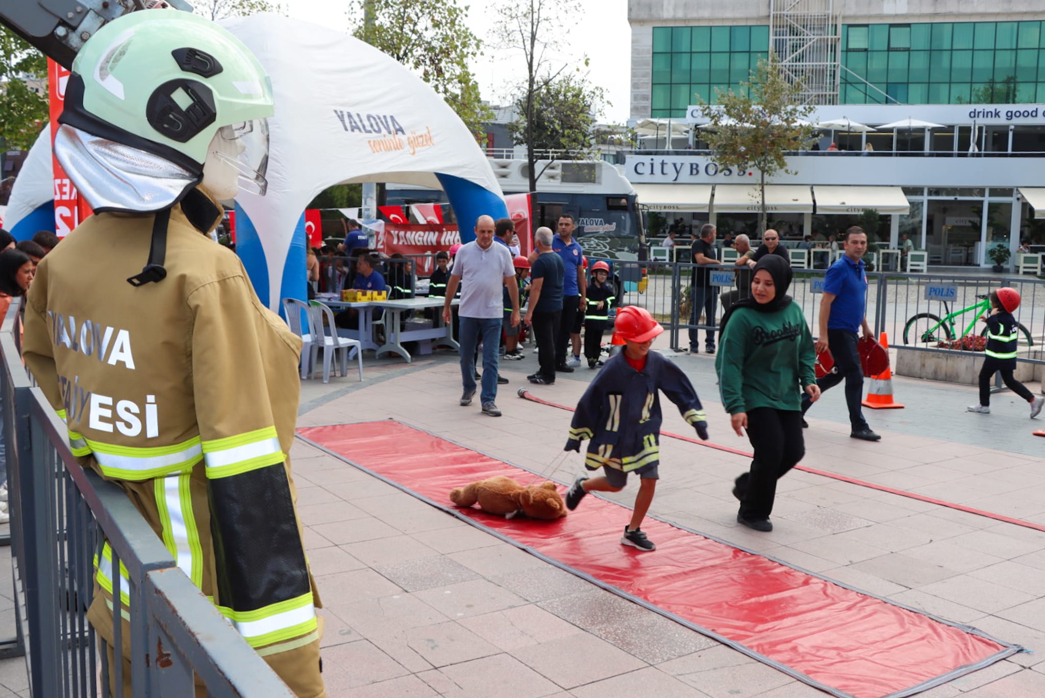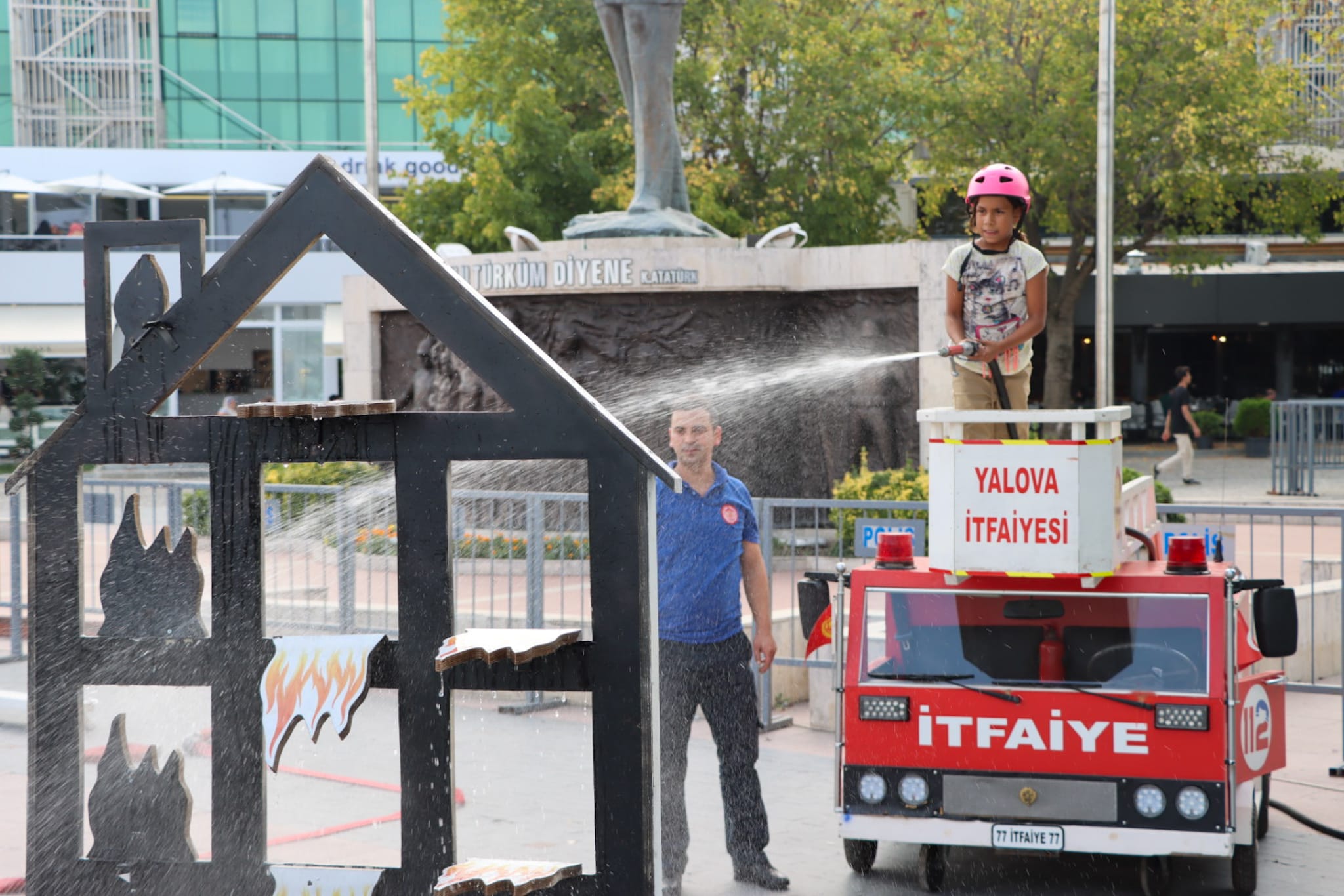 Yalova Belediyesi İtfaiye Müdürlüğü personelleri tarafından çocuklara hem teorik hem de uygulamalı olarak yangın söndürme yöntemleri eğlenceli bir şekilde anlatıldı. Maket itfaiye aracının da içerisinde yer aldığı parkurda çocuklar, kendilerine eşlik eden itfaiye erlerinin de yardımıyla zamanla yarıştı.