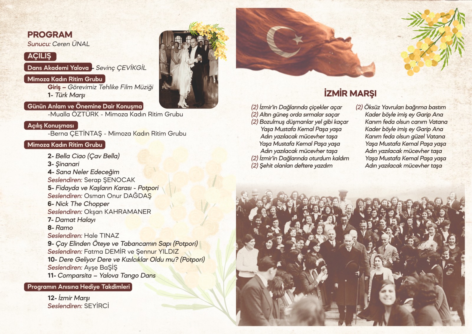 Sunuculuğunu Ceren Ünal’ın üstleneceği gecenin açılışı Dans Akademi Yalova'nın dans gösterisiyle yapılacak. Ardından Mimoza Kadın Ritim Grubu, “Görevimiz Tehlike” film müziğiyle sahneye giriş yaparak Türk Marşı’nı seslendirecek. Programın anlam ve önemine ilişkin konuşma Mualla Öztürk, açılış konuşması ise Berna Çetintaş tarafından yapılacak. Etkinlik kapsamında Mimoza Kadın Ritim Grubu; “Bella Ciao”, “Sana Neler Edeceğim”, “Fidayda”, “Ramo”, “Çay Elinden Öteye” ve “Dere Geliyor Dere” gibi birçok eseri izleyicilerle buluşturacak.