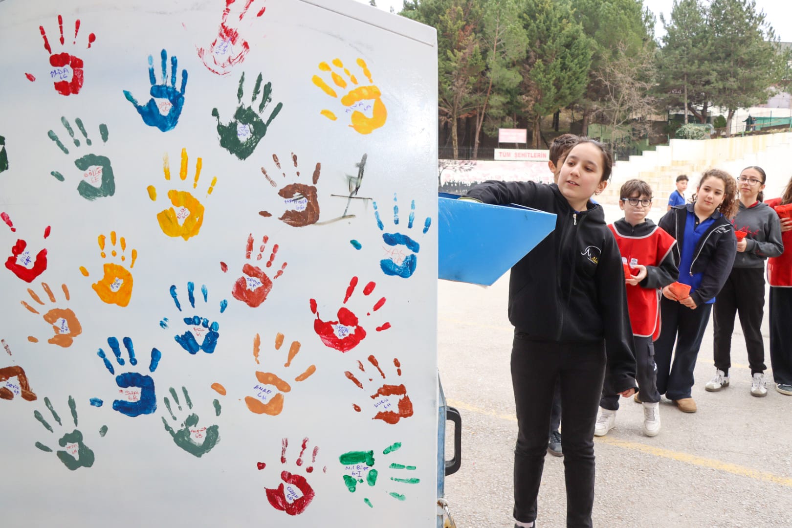 Sadece mama toplamakla kalmayan öğrenciler, proje kapsamında farkındalık oluşturmak için de yaratıcı bir etkinlik düzenledi. Boyalarla ellerini renklendiren öğrenciler, mama kumbarasının üzerine el izlerini bırakarak “sokak hayvanlarını görmezden gelmeyelim” mesajını verdi. Bu etkinlik hem projeye görsel bir anlam kazandırdı hem de sokak hayvanlarına yönelik duyarlılığın artırılmasına katkı sağladı.