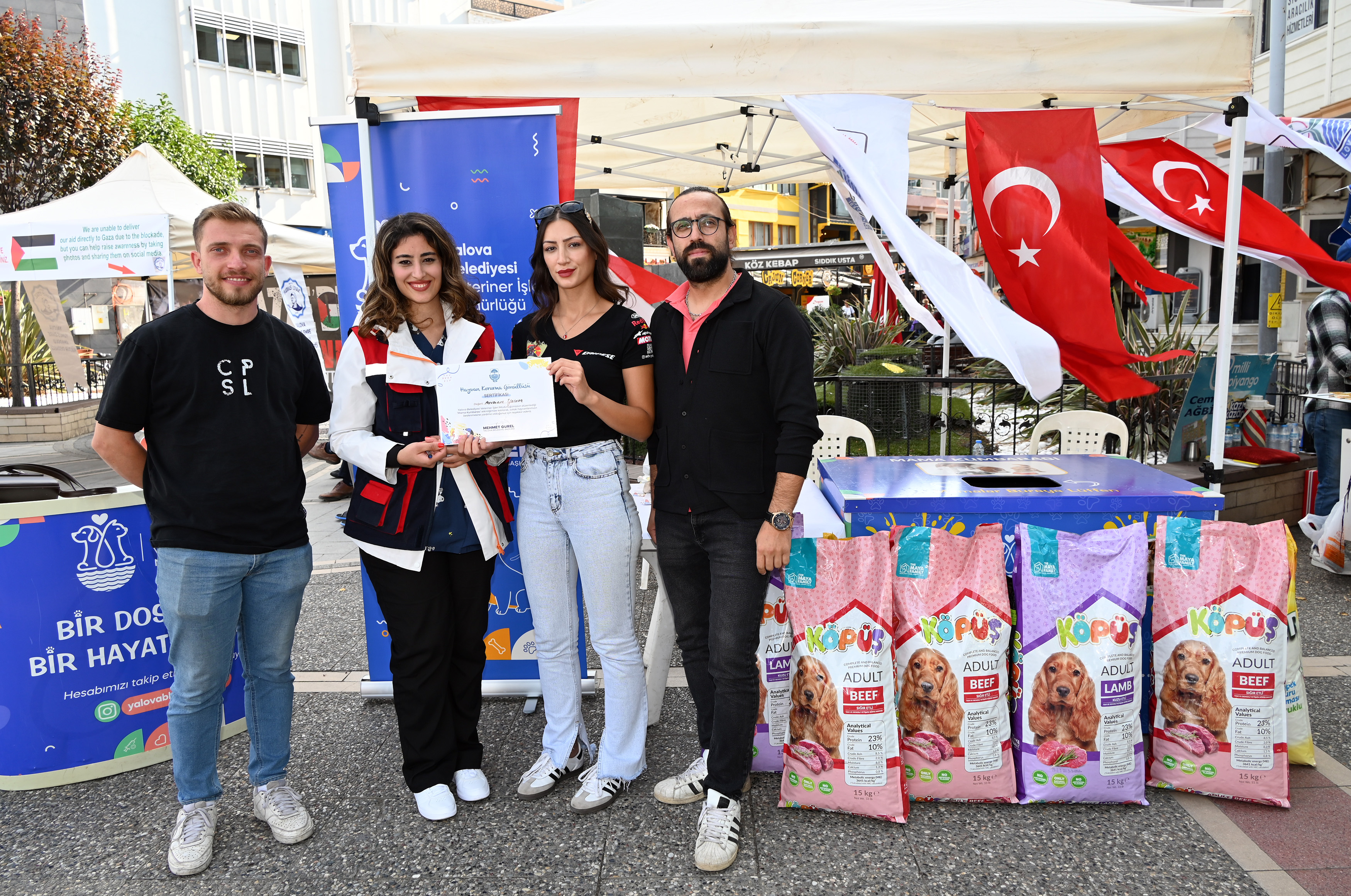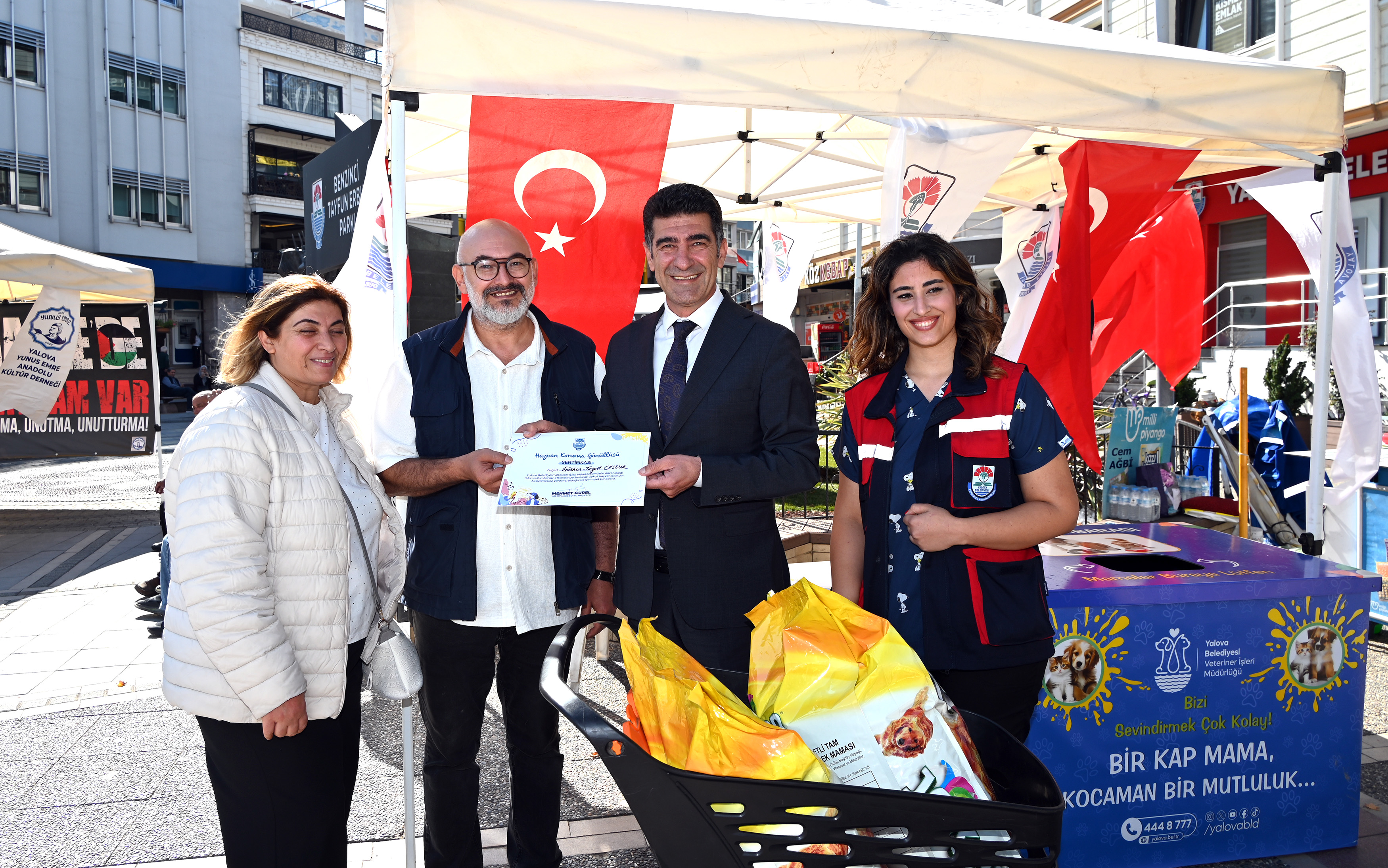 Etkinliğin ilk gününde bağışçılar, oluşturulan kumbara alanına mama bırakırken, Yalova Belediye Başkan Vekili Mesut Tutuğ da programa katılarak duyarlılık gösteren vatandaşlara teşekkür etti. Tutuğ, bağış yapan ilk vatandaşlara teşekkür sertifikası takdim ederek katkılarından ötürü şükranlarını sundu.