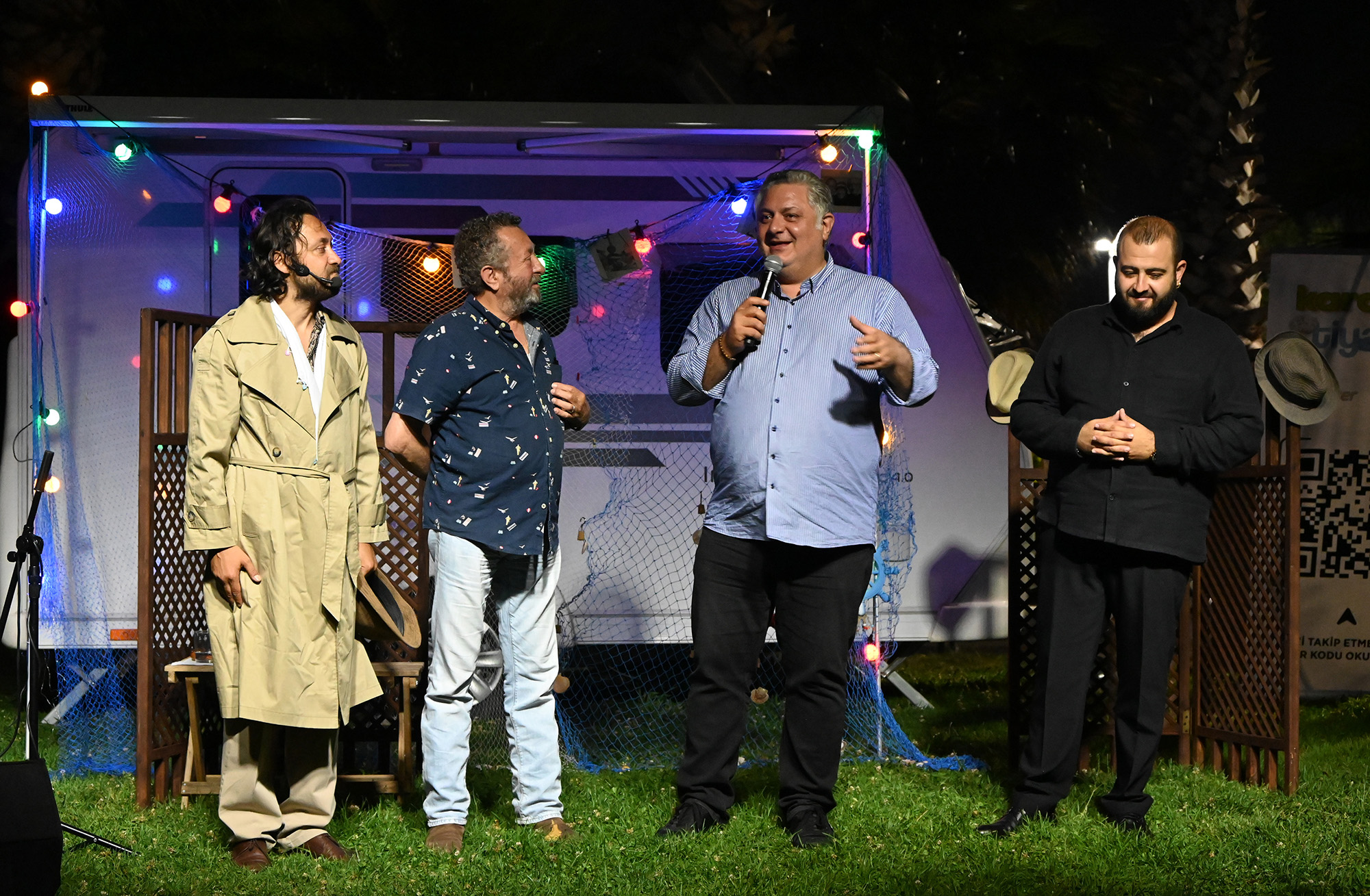 “Ben televizyonda, YouTube’da Erkan Bey’i sürekli takip ediyorum. Bana Yalova’da, deniz kenarında bir karavanın önünde onunla tanışacaksın deseler inanmazdım. Burada olduğunuz için, bu faaliyete katıldığınız için çok teşekkür ederim. Erkan Bey’in bazı köylerde bu oyunu oynamak isterim dediğini duymak çok önemli. İşte şehrin içinde bir alan içerisinde, bu şehrin güzel insanlarına böyle harikulade ustalarımızdan keyifli bir gece yaşattık. İnşallah Türkiye’nin her yöresine nasip olur. Tiyatroyu, edebiyatı, sanatın her dalını bütün yerleşimlerin hepsinde, köyden kasabaya kadar yaşamayı çok arzu ederim. Bu konuda öncü olduğunuz için çok teşekkür ediyorum. Sizleri ağırlamaktan onur duyduk. Buradan bir konudan daha bahsetmek isterim. Bir seyyar sinema organize ediyoruz. Bizim merkez köylerimizin hepsinde bu vesileyle halkımızla buluşturacağız. Belki tiyatroyu da buluşturmak lazım, bu akşam bana da fikir oldu.”
