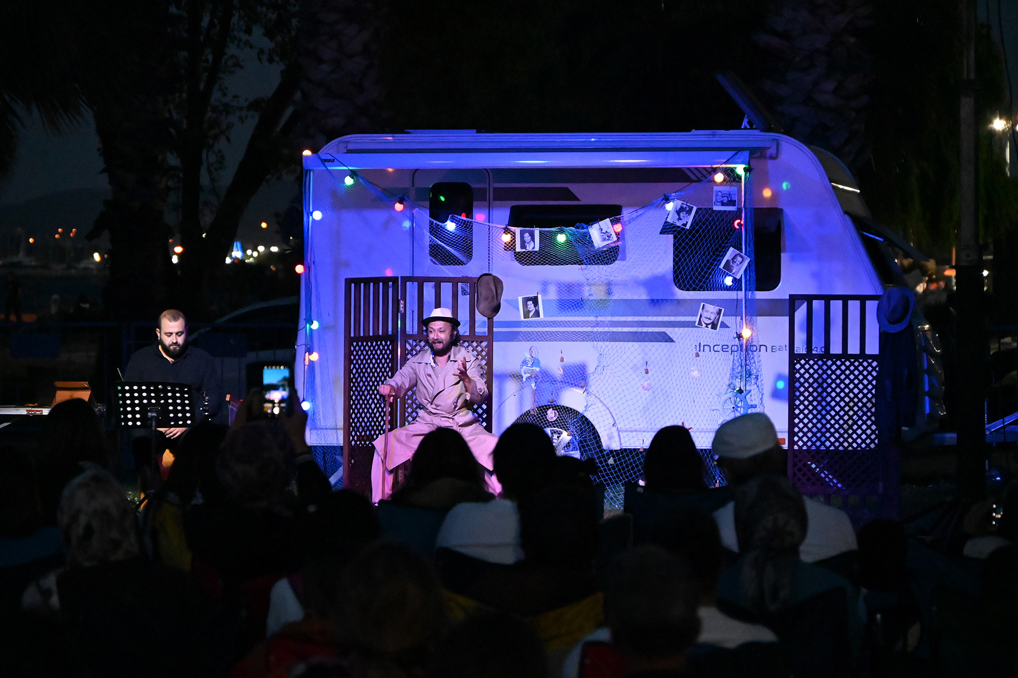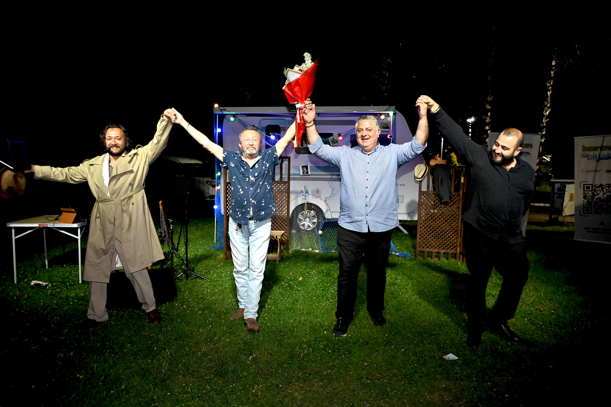 “Bu güzel yaz akşamında Sait Faik izlemeye geldiğiniz için teşekkür ediyoruz, ayaklarınıza sağlık. Sizlere Sait Faik hikâyelerini anlatmaya çalıştık. Umarım beğenmişsinizdir. Karavan tiyatro olarak böyle bir konsepti hayata geçirdik. Geçen sene 20’den fazla oyun oynadık. Yazları konseptimiz ustalarımızın yaptığı gibi bir panayır havasında seyirciyle göz göze, diz dize temas ederek sizlere sunabilmekti. İşte böyle güzel belediyelerde ben burada kendi adıma, ekibim adına Yalova Belediyesi’ne ve Başkanımıza çok teşekkür ediyorum.”