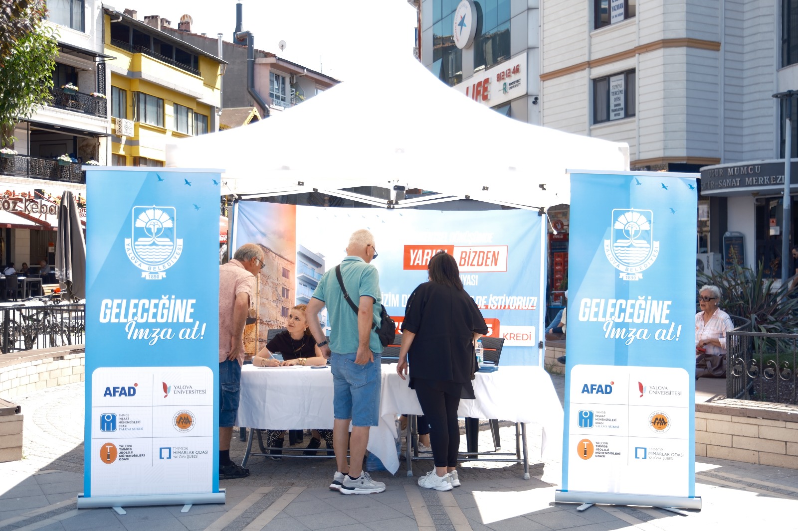 Yalova Belediye Başkanı Mehmet Gürel öncülüğünde Çevre Şehircilik ve İklim Değişikliği Bakanlığı’nın “Kentsel Dönüşümde Yarısı Bizden” uygulamasından Yalova’nın da faydalanabilmesi ve konuda dikkatin deprem kuşağı üzerinde bulunan Yalova’ya çekilmesi amacıyla başlatılan imza kampanyasına vatandaşlar destek oluyor. Geçtiğimiz Cuma günü Uğur Mumcu Kültür Merkezi önünde düzenlenen tanıtım programında ilk imzalar atılırken, kampanya şimdi kent genelinde stantlar aracılığıyla devam ediyor.