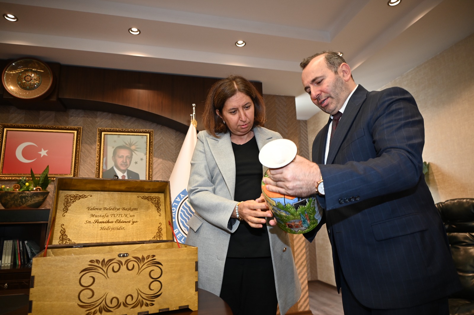 Tutuk, ziyaretin anısına Ekinci’ye Yalova temalı çini vazo hediye etti.