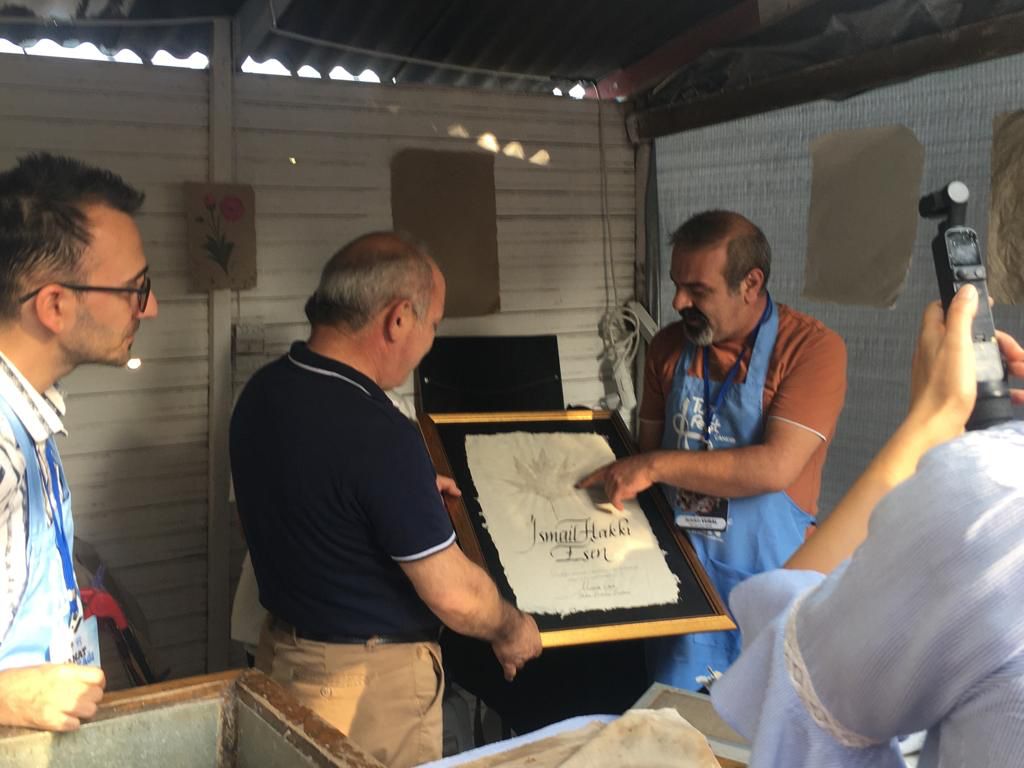 Çankırı Belediye Başkanı İsmail Hakkı Esen’in de katıldığı kağıt yapımı gösterisinde son dönemde geliştirilen atölyelerle profesyonelleşen kağıt müzesi, farkındalık oluşturulan sunumlarla göz doldurdu. Gösteri sonunda Başkan İsmail Hakkı Esen’e, Yalova Kâğıdı’ndan hat sanatı ile yapılan tablo hediye edildi.