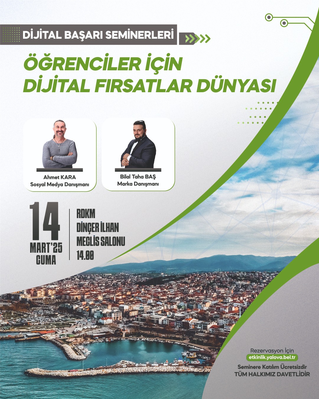 Yalova Belediyesi, dijital dünyada fark yaratmak isteyen esnaf ve öğrenciler için iki önemli seminer düzenliyor. “Dijital Dünyada Esnafın Gücü” ve “Öğrenciler için Dijital Fırsatlar Dünyası” başlıklı seminerler, katılımcılara dijital pazarlama, marka yönetimi ve online fırsatlar hakkında önemli bilgiler sunacak.