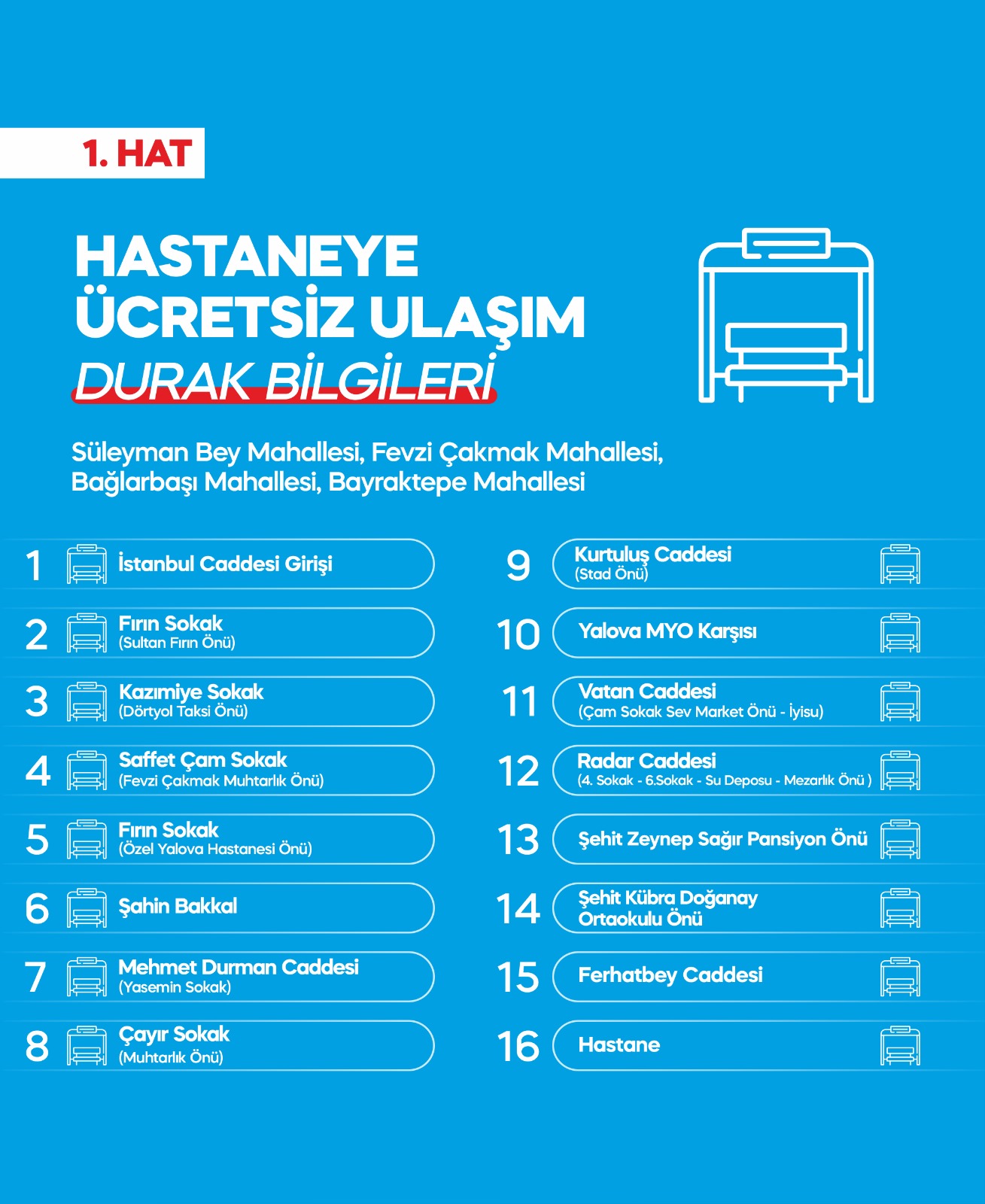- Hat; Süleyman Bey Mahallesi, Fevzi Çakmak Mahallesi, Bağlarbaşı Mahallesi, Bayraktepe Mahallesi’ni kapsayacak. Duraklar: İstanbul Caddesi girişi, Fırın Sokak (Sultan Fırın önü), Kazımiye Sokak (Dörtyol Taksi önü), Saffet Çam Sokak (Fevzi Çakmak Muhtarlık önü), Fırın Sokak (Özel Yalova Hastanesi önü), Şahin Bakkal, Mehmet Durman Caddesi (Yasemin Sokak A101 önü - Çayır Sokak Muhtarlık önü - Kurtuluş Caddesi kesişimi stat önü), Yalova MYO karşısı, Vatan Caddesi (Çam Sokak Sev Market önü - İyisu), Radar Caddesi (4. Sokak - 6. Sokak - Su deposu önü - Şehit Zeynep Sağır Pansiyon önü - Şehit Kübra Doğanay Ortaokulu önü - Mezarlık önü - Ferhatbey Caddesi kesişimi), Hastane.