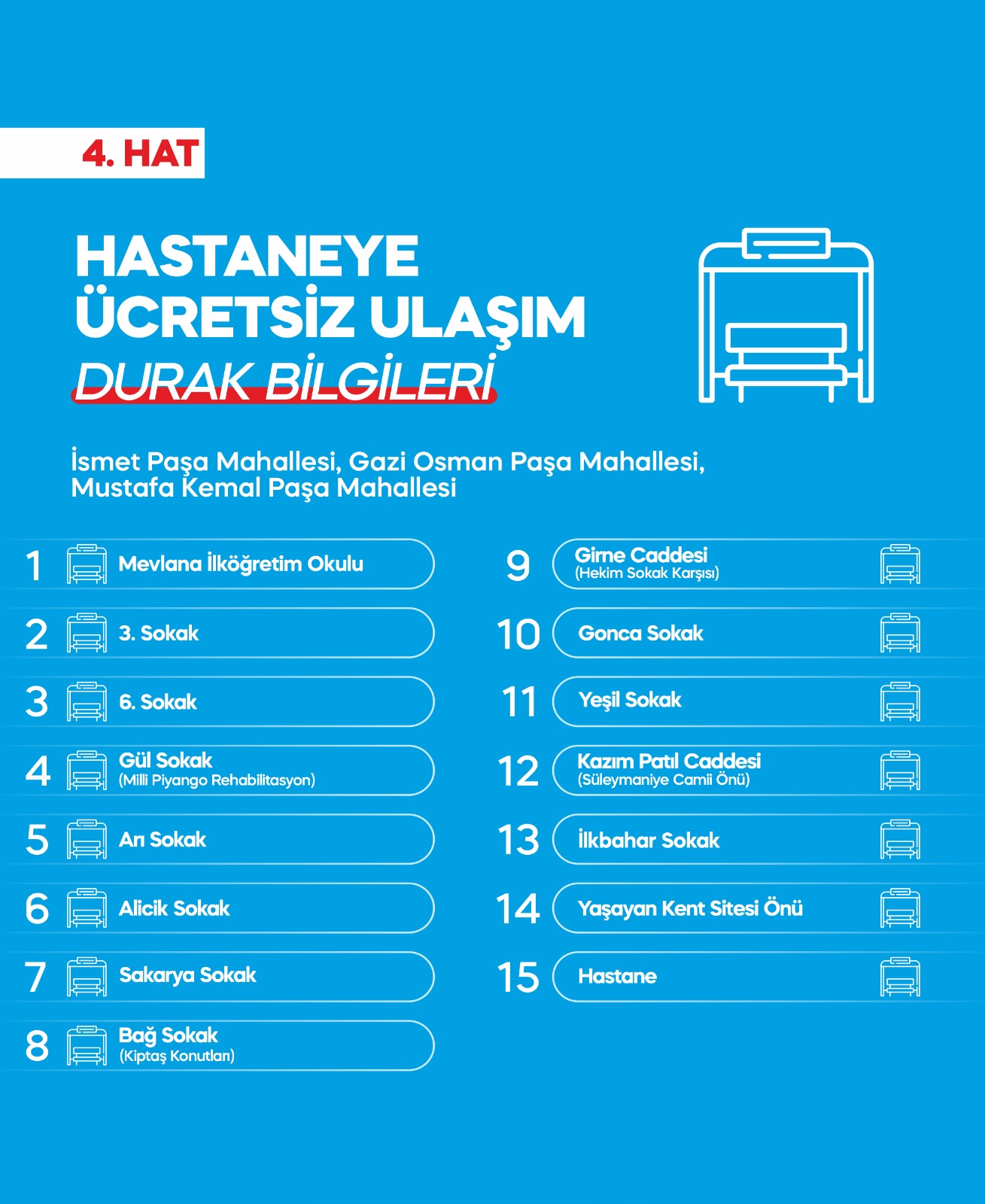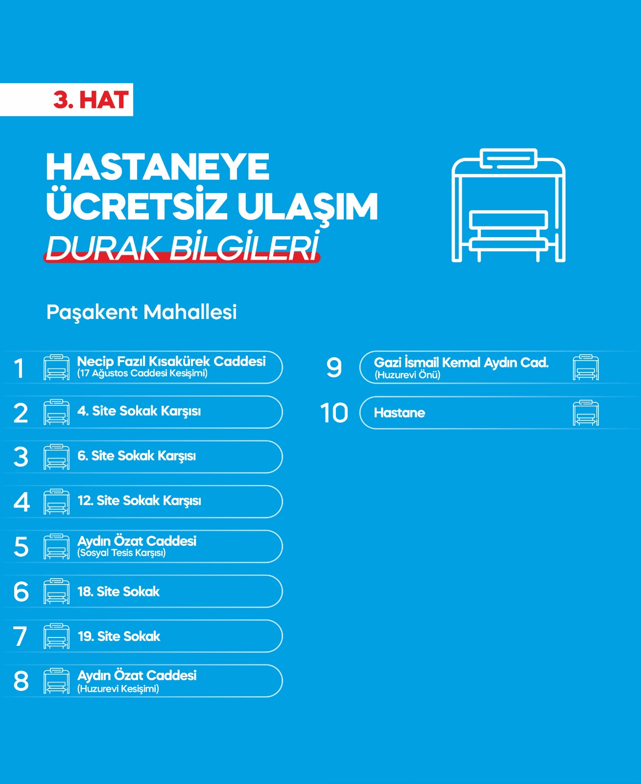 - Hat Paşakent Mahallesi Duraklar: Necip Fazıl Kısakürek Caddesi (17 Ağustos Caddesi kesişimi), 4. Site Sokak Karşısı, 6. Site Sokak Karşısı, 12. Site Sokak Karşısı, Aydın Özat Caddesi (Sosyal Tesis Karşısı), 18. Site Sokak, 19. Site Sokak, Aydın Özat Caddesi (Huzurevi Kesişimi) Gazi İsmail Kemal Aydın Caddesi (Huzurevi Önü), Hastane.