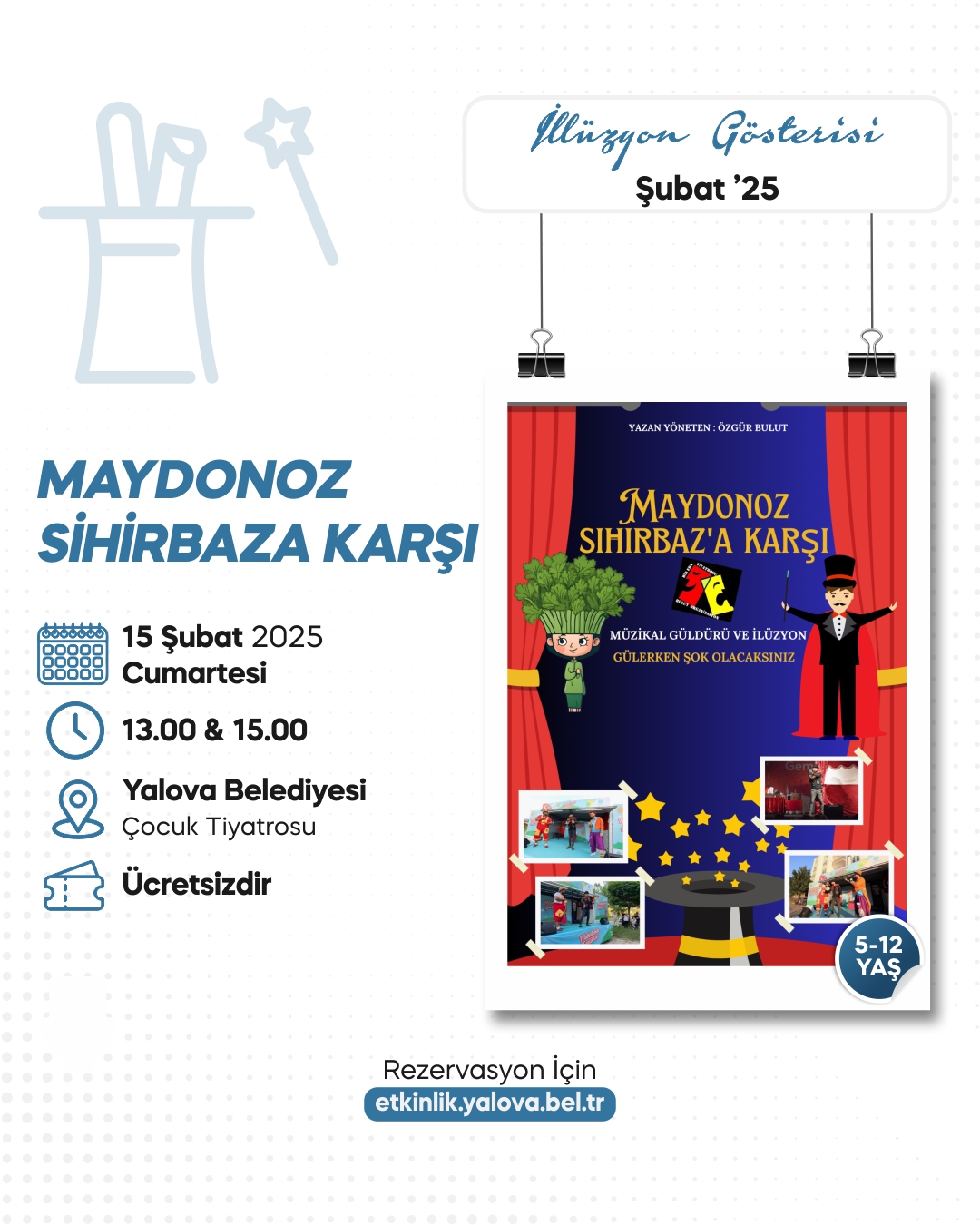 Yalova Belediyesi Çocuk Tiyatrosu, Şubat ayında minikler için birbirinden renkli oyunlar ve atölyeler hazırladı. 8 Şubat Cumartesi günü saat 13.00 ve 15.00'te "Benimle Oynar mısın?" adlı interaktif çocuk oyunu, çocukları eğlenceli bir maceraya davet ediyor. 12 Şubat Çarşamba günü ise "Sevgi Kavanozu" adlı okul öncesi etkinlik atölyesi, saat 11.00, 13.00 ve 14 Şubat Cuma günü 15.00 ve 17.00'de çocuklarla buluşacak.