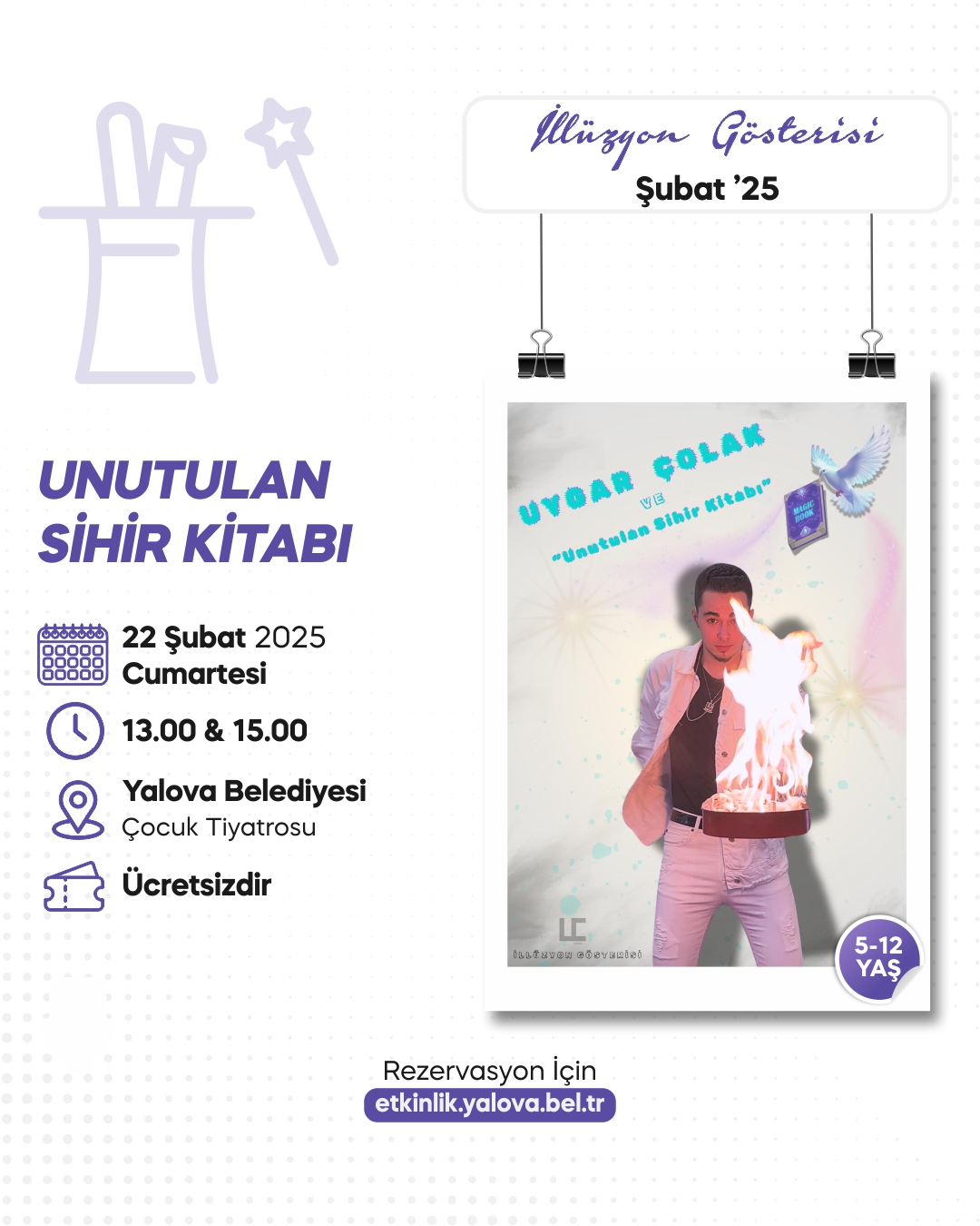 Yalova Belediyesi, Şubat ayı boyunca çocuklar, gençler ve yetişkinler için birbirinden eğlenceli ve öğretici etkinlikler düzenliyor. Tiyatro oyunları, illüzyon gösterileri, şiir dinletileri ve atölye çalışmalarıyla dolu bu program, sanatseverler ve aileler için keyifli bir ay vaat ediyor.