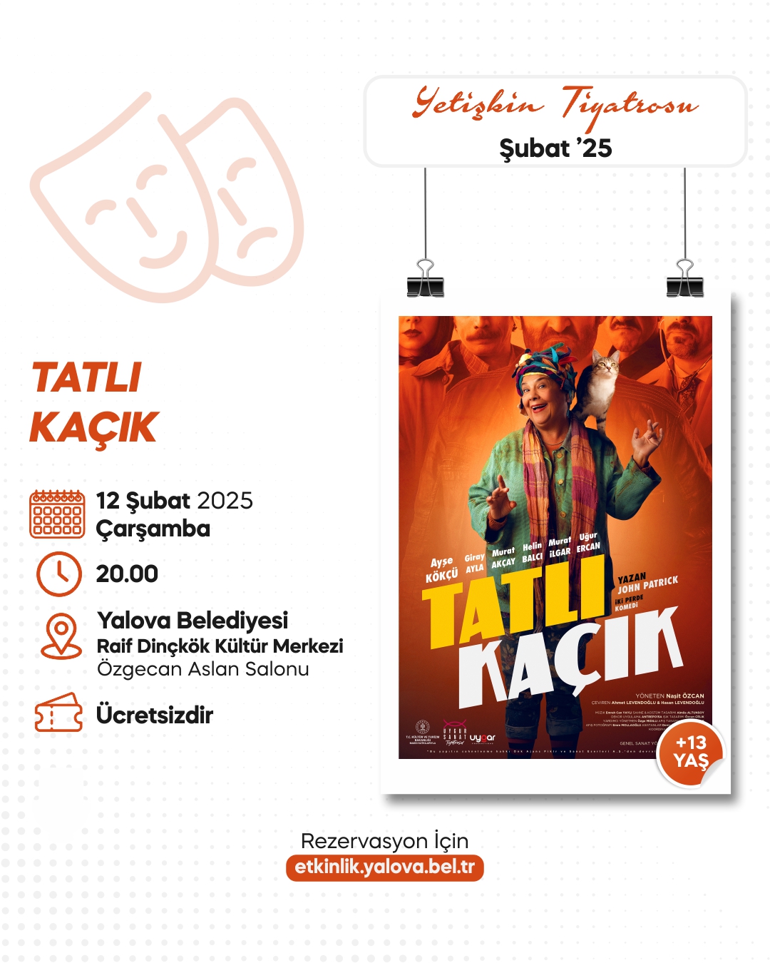 Yetişkinler için de unutulmaz anlar sunan Yalova Belediyesi, 12 Şubat Çarşamba günü saat 20.00'de RDKM Özgecan Aslan Salonu'nda "Tatlı Kaçık" adlı yetişkin tiyatrosunu sahneleyecek. 19 Şubat Çarşamba günü ise "Unutma Bizi" adlı yetişkin tiyatrosu, Yalova Belediyesi Çocuk Tiyatrosu'nda izleyicilerle buluşacak. 26 Şubat Çarşamba günü saat 20.00'de RDKM Özgecan Aslan Salonu'nda düzenlenecek "Şiirlerin Unutulmaz Hikâyeleri" adlı şiir dinletisi, edebiyatseverlere duygu dolu bir akşam vaat ediyor.