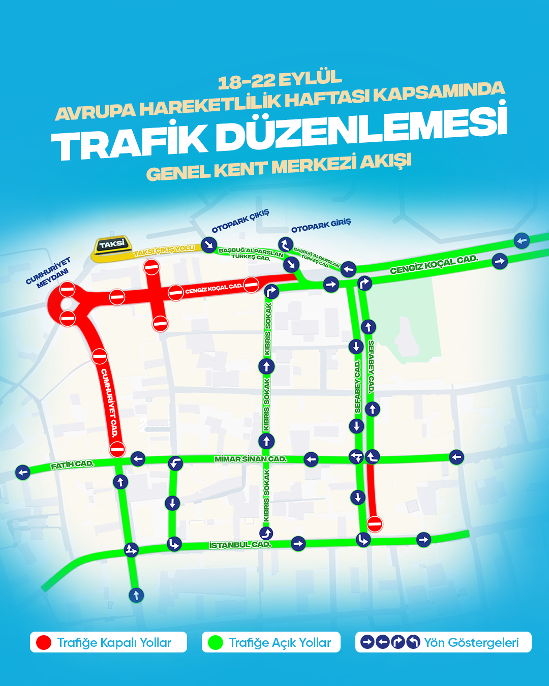 “Avrupa Hareketlilik Haftası kapsamında kent merkezimizde uygulayacağımız bu düzenlemelerle hem sürdürülebilir ulaşım alışkanlıklarını teşvik etmeyi hem de vatandaşlarımız için daha güvenli ve yaşanabilir bir şehir ortamı oluşturmayı hedefliyoruz. Tüm hemşehrilerimizin 18-22 Eylül tarihleri arasında geçerli olacak düzenlemelere destek olmalarını rica ediyoruz.”