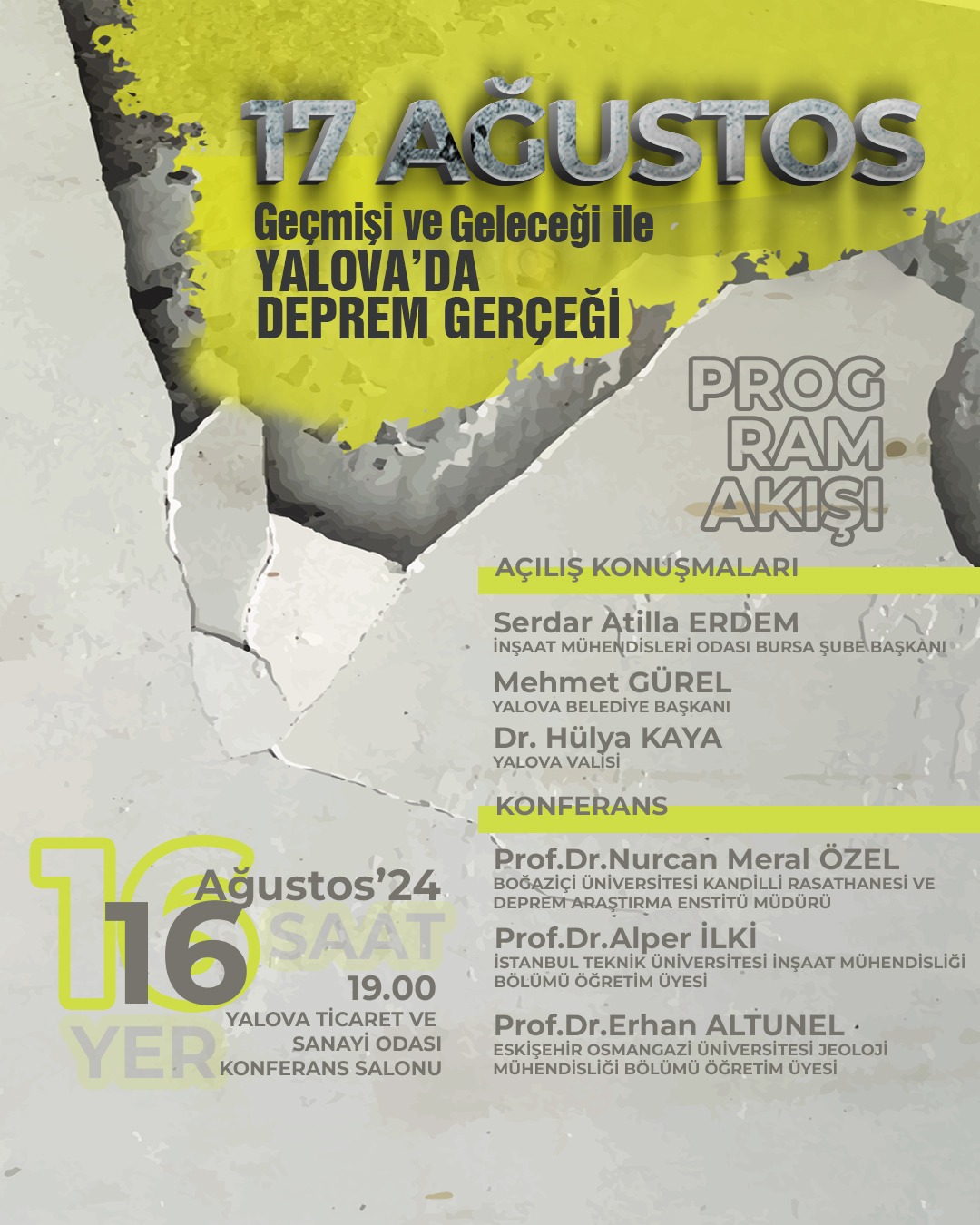 Yalova Belediyesi, Yalova Valiliği, Yalova Ticaret ve Sanayi Odası, Yalova Üniversitesi ve İnşaat Mühendisleri Odası iş birliği ile düzenlenen konferans, 16 Ağustos 2024 Cuma günü saat 19:00'da Yalova Ticaret ve Sanayi Odası Konferans Salonu’nda gerçekleştirilecek.