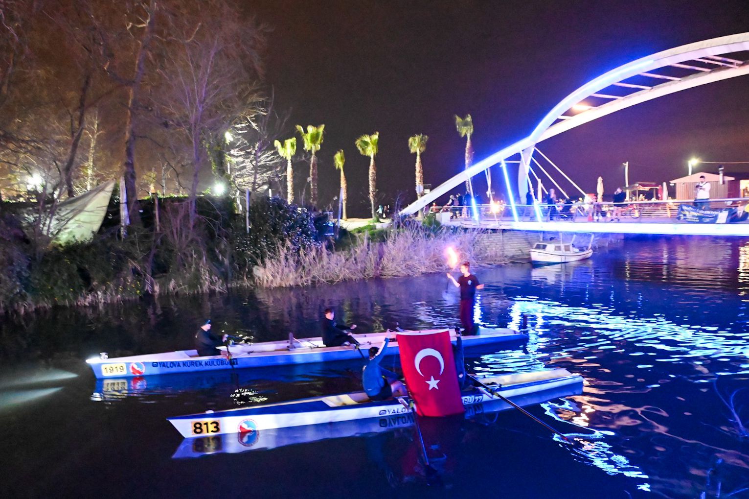 Öte yandan kulüp üyeleri tarafından gece de gösteriler yapıldı. Yalova Kürek Kulübü sporcuları havanın kararması ile birlikte Ak Şemsettin Köprüsü kenarında hazırladıkları ışık gösterisini halkın beğenisine sundu.