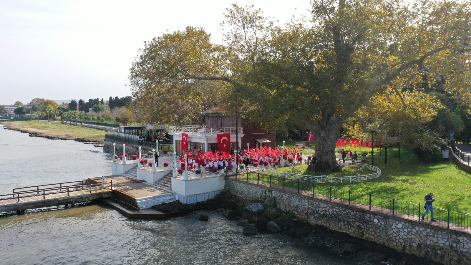 Ay yıldızlı bayraklarıyla Yürüyen Köşk’e akın eden yüzlerce öğrenci, köşk bahçesinde görsel şölen yaşattı. Renkli görüntülere ev sahipliği yapan köşke bir jestte Yalova Hava Meydan Komutanlığı’ndan geldi. Komutanlığına ait 2 eğitim uçağı Yürüyen Köşk semalarında gösteri yaptı.