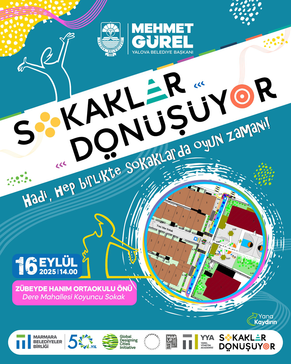 Yalova Belediyesi, Marmara Belediyeler Birliği Yerel Yönetimler Akademisi tarafından “Sokaklar Dönüşüyor” projesi kapsamında hayata geçirilen Yalova’nın ilk çocuk dostu sokağı, Zübeyde Hanım İlköğretim Okulu’nun yer aldığı Dere Mahallesi Koyuncu Sokak’ta 16 Eylül 2025 Salı günü saat 14.00’te düzenlenecek programla açılıyor.