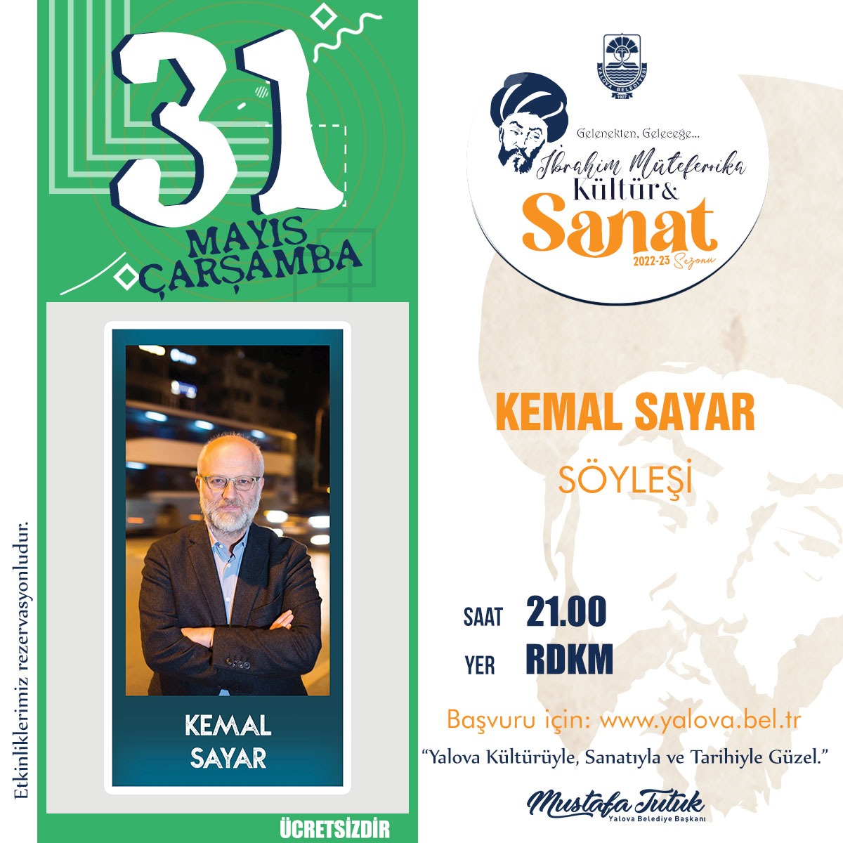 31 Mayıs Çarşamba, Kemal Sayar Söyleşisi, RDKM, saat: 21.00