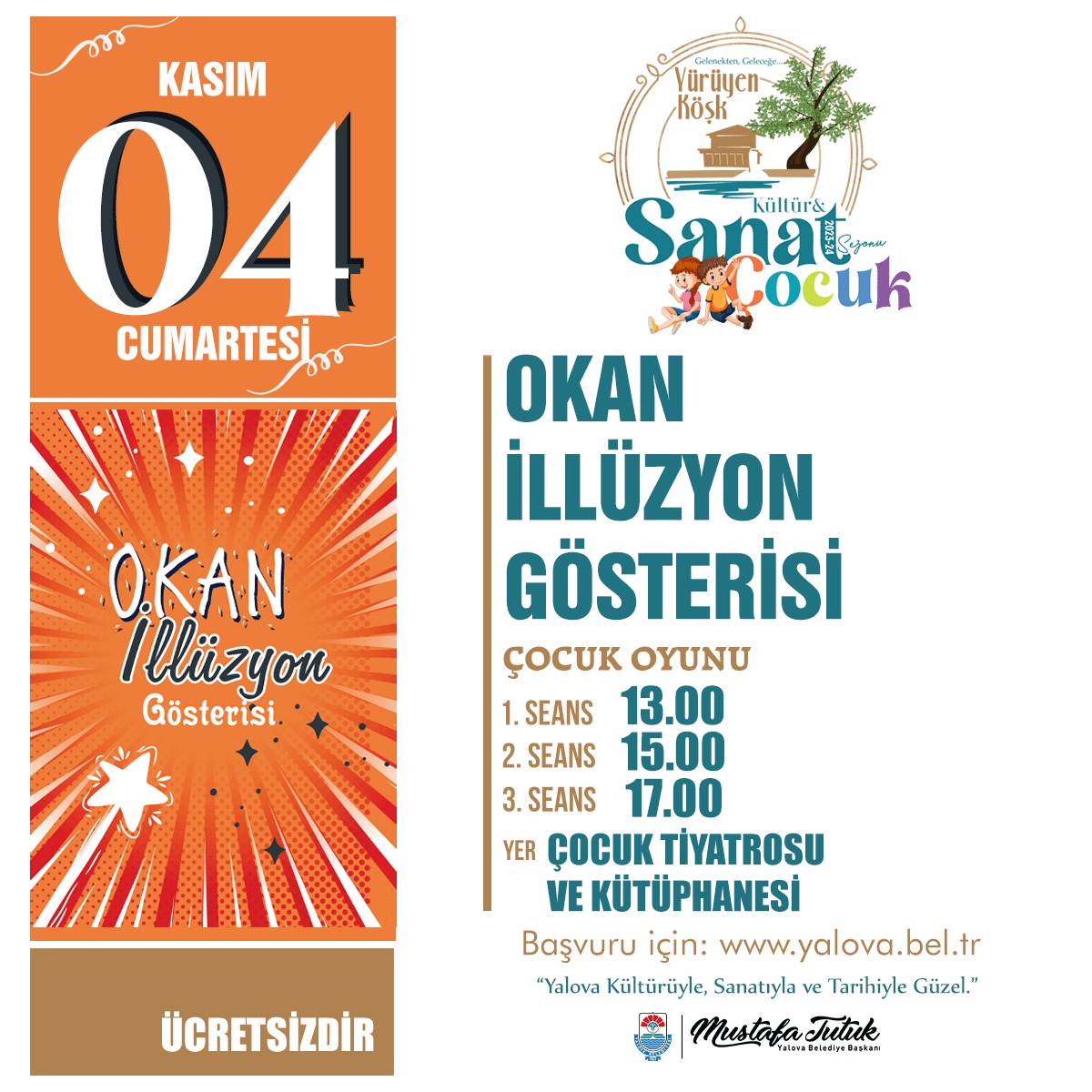 04 Kasım Cumartesi saat 13.00, 15.00 ve 17.00 Okan İllüzyon Gösterisi (Çocuk Oyunu) Çocuk Tiyatrosu ve Kütüphanesi